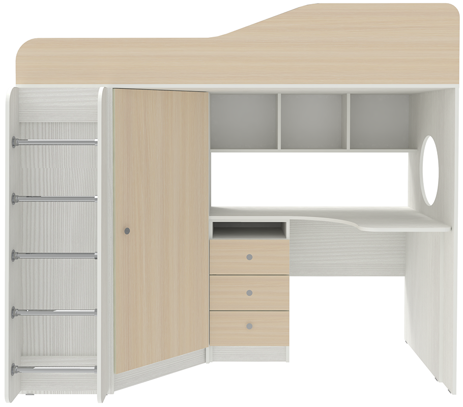 Кровать-чердак Кадет 1 оснащен одним спальным местом, металлической наставной лестницей, письменным столом с тремя выдвижными ящиками под столешницей, полкой над столешницей и угловым шкафом для одежды. Данная модель подойдет как для детей младших классов, так и для детей более старшего возраста. Такая кровать поразит вас своей компактностью, вместительностью и практичностью. Комплектация: - Кровать чердак ( спальное место 80 х 190 см), размеры (Д*Г*В): 1932*832*1716 мм - Встроенный угловой шкаф с полками и штангой для одежды - Письменный стол с тумбой под столом - Металлическая лестница - Стеллаж для книг под спальным местом Основные параметры : - Кроватный модуль, размеры (Д*Г*В): 1932*1032*1716 мм - Спальное место: 800*1900 мм - Угловой шкаф, размеры (Д*Г*В): 832*832*1350 мм - Стол, размеры (Д*Г*В): 1100*740*735 мм - Лестница, размеры (Д*Г*В): 400*200*1300 мм - Высота борта: 350 мм Материалы, используемые при изготовлении:Ламинированная ДСП, края лестницы, борта кровати декорированы противоударной кромкой ПВХ.На цветных фасадах: цвет кромки - бежевый. Модель универсальна - сторона определяется при сборке. Матрасы в комплект не входят - приобретаются отдельно. Рекомендованная высота матраса: 50-150 ммХарактеристики