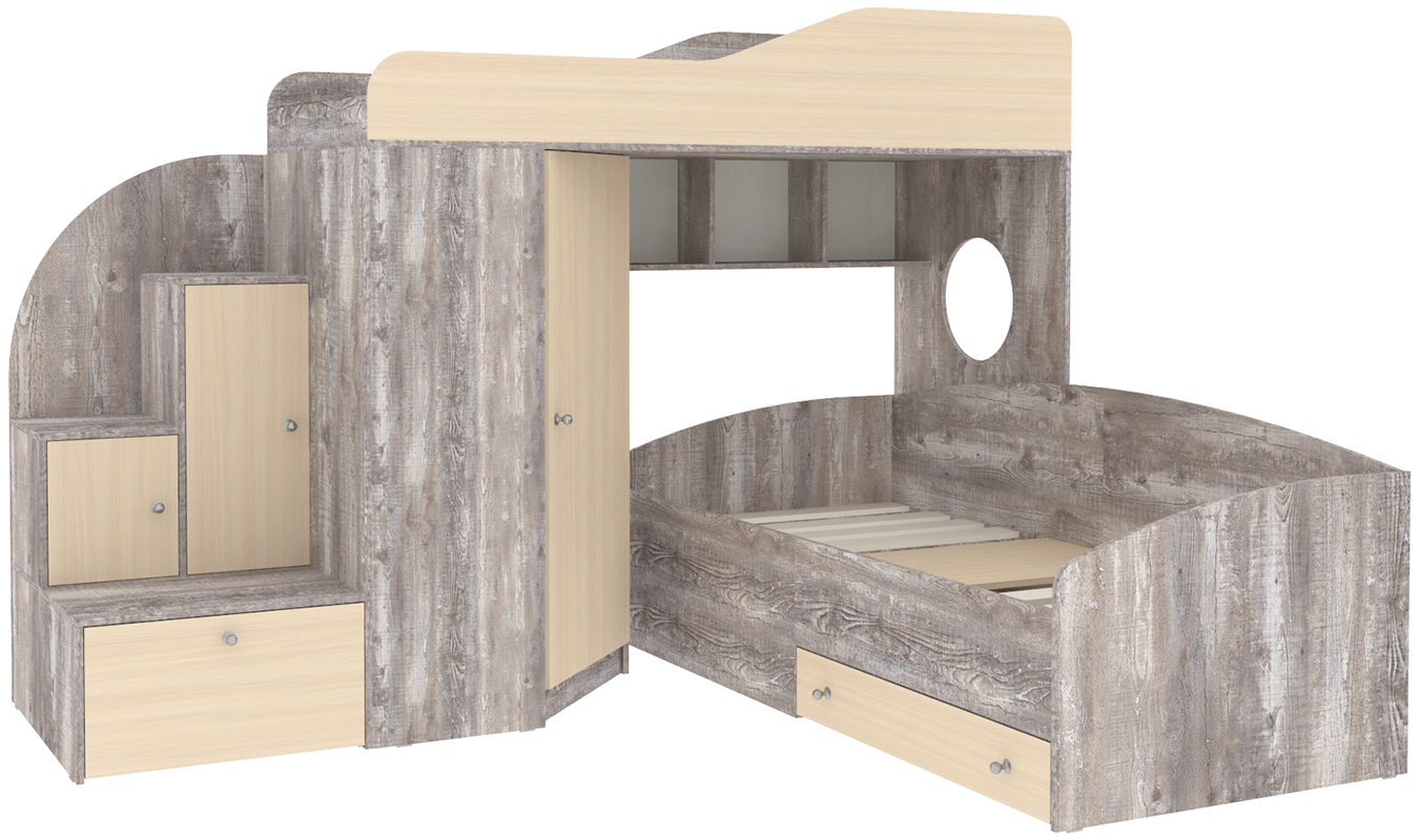 Кровать чердак Кадет 2 оснащен двумя спальными местами, необычными ступенями с дверцами для хранения игрушек и угловым шкафом для одежды и белья. Данная модель подойдет как для детей младших классов, так и для детей более старшего возраста. Такая кровать поразит вас своей компактностью, вместительностью и практичностью. Основные параметры: - Кроватный модуль, размеры (Д*Г*В): 257*204*172см - Верхнее спальное место: 800*1900 мм - Нижнее спальное место: 900*2000 мм - Угловой шкаф, размеры (Д*Г*В): 832*832*1350 мм - Лестница, размеры (Д*Г*В): 646*832*1350 мм - Высота борта: 350 мм - Рекомендованная высота матраса: 50-150 мм Материалы, используемые при изготовлении:Ламинированная ДСП, края лестницы, борта кровати декорированы противоударной кромкой ПВХ.На цветных фасадах: цвет кромки - бежевый. Модель универсальна - сторона определяется при сборке. Матрасы в комплект не входят - приобретаются отдельно.Характеристики