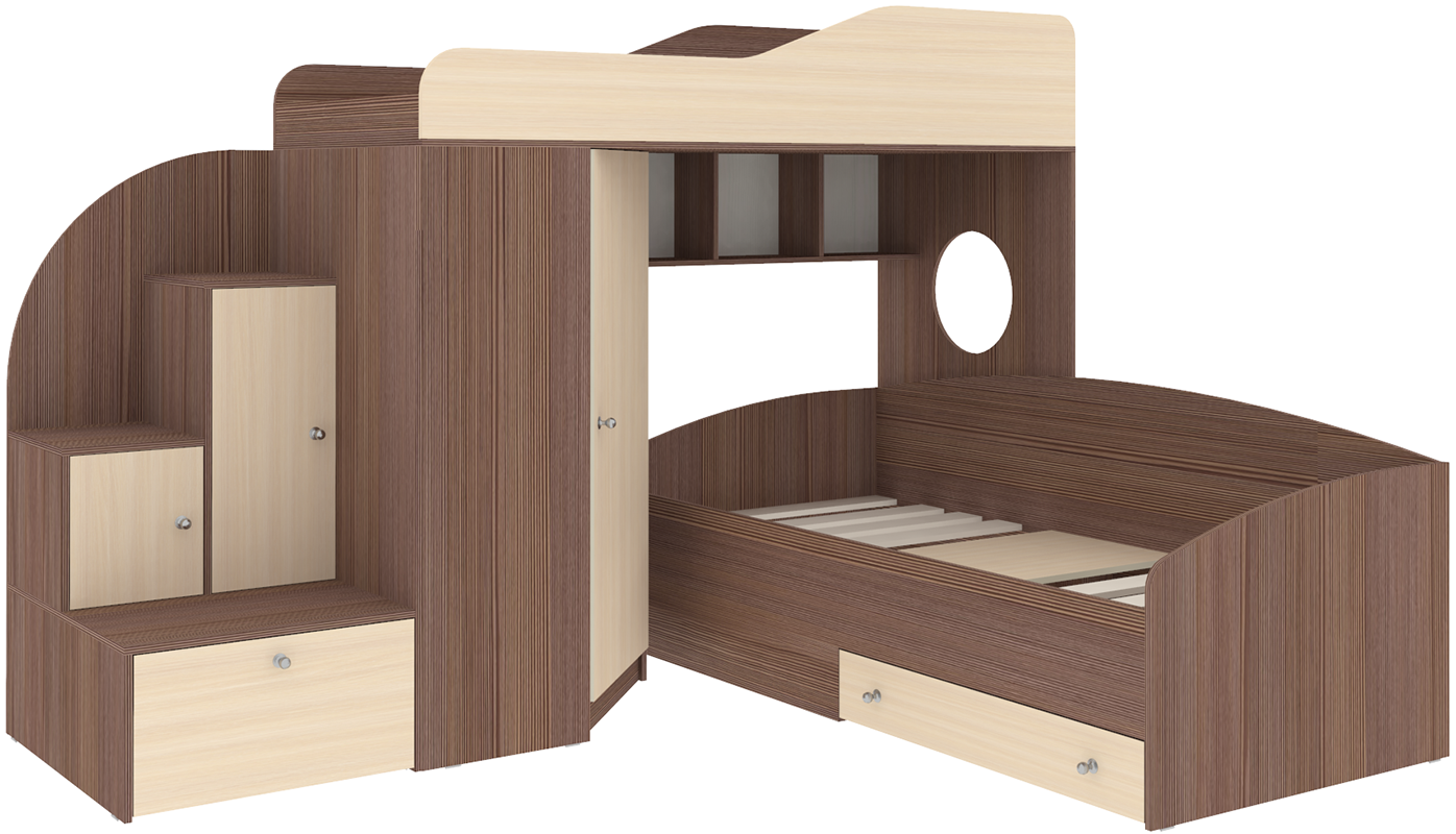Кровать чердак Кадет 2 оснащен двумя спальными местами, необычными ступенями с дверцами для хранения игрушек и угловым шкафом для одежды и белья. Данная модель подойдет как для детей младших классов, так и для детей более старшего возраста. Такая кровать поразит вас своей компактностью, вместительностью и практичностью. Основные параметры: - Кроватный модуль, размеры (Д*Г*В): 257*204*172см - Верхнее спальное место: 800*1900 мм - Нижнее спальное место: 900*2000 мм - Угловой шкаф, размеры (Д*Г*В): 832*832*1350 мм - Лестница, размеры (Д*Г*В): 646*832*1350 мм - Высота борта: 350 мм - Рекомендованная высота матраса: 50-150 мм Материалы, используемые при изготовлении:Ламинированная ДСП, края лестницы, борта кровати декорированы противоударной кромкой ПВХ.На цветных фасадах: цвет кромки - бежевый. Модель универсальна - сторона определяется при сборке. Матрасы в комплект не входят - приобретаются отдельно.Характеристики