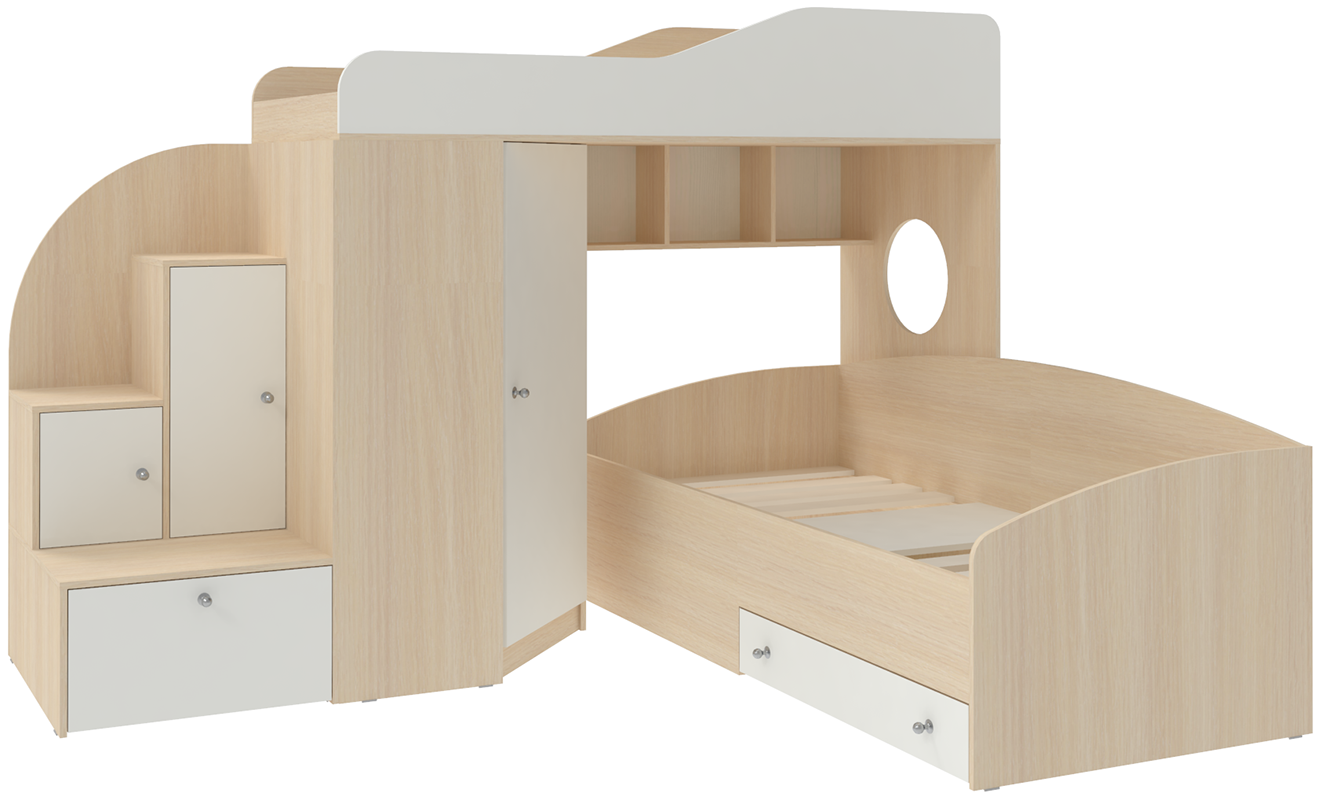 Кровать чердак Кадет 2 оснащен двумя спальными местами, необычными ступенями с дверцами для хранения игрушек и угловым шкафом для одежды и белья. Данная модель подойдет как для детей младших классов, так и для детей более старшего возраста. Такая кровать поразит вас своей компактностью, вместительностью и практичностью. Основные параметры: - Кроватный модуль, размеры (Д*Г*В): 257*204*172см - Верхнее спальное место: 800*1900 мм - Нижнее спальное место: 900*2000 мм - Угловой шкаф, размеры (Д*Г*В): 832*832*1350 мм - Лестница, размеры (Д*Г*В): 646*832*1350 мм - Высота борта: 350 мм - Рекомендованная высота матраса: 50-150 мм Материалы, используемые при изготовлении:Ламинированная ДСП, края лестницы, борта кровати декорированы противоударной кромкой ПВХ.На цветных фасадах: цвет кромки - бежевый. Модель универсальна - сторона определяется при сборке. Матрасы в комплект не входят - приобретаются отдельно.Характеристики
