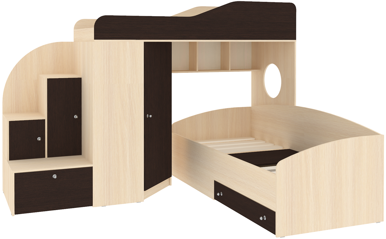 Кровать чердак Кадет 2 оснащен двумя спальными местами, необычными ступенями с дверцами для хранения игрушек и угловым шкафом для одежды и белья. Данная модель подойдет как для детей младших классов, так и для детей более старшего возраста. Такая кровать поразит вас своей компактностью, вместительностью и практичностью. Основные параметры: - Кроватный модуль, размеры (Д*Г*В): 257*204*172см - Верхнее спальное место: 800*1900 мм - Нижнее спальное место: 900*2000 мм - Угловой шкаф, размеры (Д*Г*В): 832*832*1350 мм - Лестница, размеры (Д*Г*В): 646*832*1350 мм - Высота борта: 350 мм - Рекомендованная высота матраса: 50-150 мм Материалы, используемые при изготовлении:Ламинированная ДСП, края лестницы, борта кровати декорированы противоударной кромкой ПВХ.На цветных фасадах: цвет кромки - бежевый. Модель универсальна - сторона определяется при сборке. Матрасы в комплект не входят - приобретаются отдельно.Характеристики