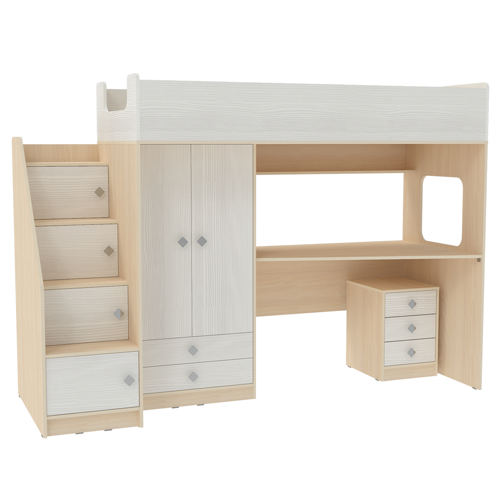 Кровать чердак Л-A606.3с тумбой – великолепный комплект мебели, решение для площади малых габаритов, экономия пространства. Комплект занимает немного места - решение для площади малых габаритов, экономия пространства. Высота кровати чердака всего 1677 мм. Учебная зона со столом под спальным местом открывает возможности для письменных работ, а также здесь удобно расположить ноутбук. Вместительная тумба Л-04 отлично подойдет для хранения канцелярских принадлежностей и учебников. Вместительный шкаф для хранения одежды, белья, игрушек или иных вещей. Внизу шкафа располагается выкатные ящики, в которых можно хранить отдельно мелкие предметы. Расположение ящиков позволяет ребенку легко извлекать необходимые вещи самостоятельно. Световое окно прямоугольной формы - дополнительное освещение, элемент для игры и возможность родителям наблюдать за ребенком. Интегрированная угловая лестница оснащена боковым бортиком и местами для хранения с ручками плавной формы, без острых углов. Мягкий противоударный кант – дополнительная безопасность для детей. По вашему выбору комплект может быть собран как на левую, так и на правую сторону.Характеристики