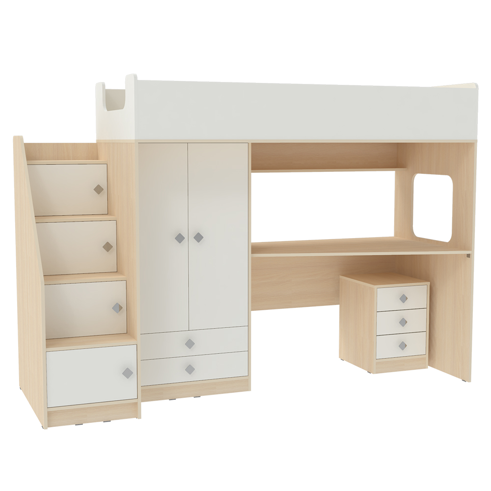 Кровать чердак Л-A606.3с тумбой – великолепный комплект мебели, решение для площади малых габаритов, экономия пространства. Комплект занимает немного места - решение для площади малых габаритов, экономия пространства. Высота кровати чердака всего 1677 мм. Учебная зона со столом под спальным местом открывает возможности для письменных работ, а также здесь удобно расположить ноутбук. Вместительная тумба Л-04 отлично подойдет для хранения канцелярских принадлежностей и учебников. Вместительный шкаф для хранения одежды, белья, игрушек или иных вещей. Внизу шкафа располагается выкатные ящики, в которых можно хранить отдельно мелкие предметы. Расположение ящиков позволяет ребенку легко извлекать необходимые вещи самостоятельно. Световое окно прямоугольной формы - дополнительное освещение, элемент для игры и возможность родителям наблюдать за ребенком. Интегрированная угловая лестница оснащена боковым бортиком и местами для хранения с ручками плавной формы, без острых углов. Мягкий противоударный кант – дополнительная безопасность для детей. По вашему выбору комплект может быть собран как на левую, так и на правую сторону.Характеристики