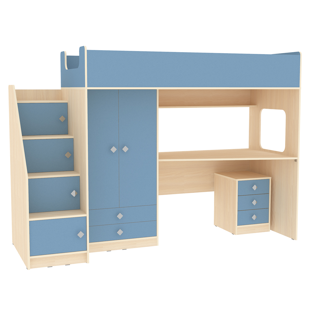 Кровать чердак Л-A606.3с тумбой – великолепный комплект мебели, решение для площади малых габаритов, экономия пространства. Комплект занимает немного места - решение для площади малых габаритов, экономия пространства. Высота кровати чердака всего 1677 мм. Учебная зона со столом под спальным местом открывает возможности для письменных работ, а также здесь удобно расположить ноутбук. Вместительная тумба Л-04 отлично подойдет для хранения канцелярских принадлежностей и учебников. Вместительный шкаф для хранения одежды, белья, игрушек или иных вещей. Внизу шкафа располагается выкатные ящики, в которых можно хранить отдельно мелкие предметы. Расположение ящиков позволяет ребенку легко извлекать необходимые вещи самостоятельно. Световое окно прямоугольной формы - дополнительное освещение, элемент для игры и возможность родителям наблюдать за ребенком. Интегрированная угловая лестница оснащена боковым бортиком и местами для хранения с ручками плавной формы, без острых углов. Мягкий противоударный кант – дополнительная безопасность для детей. По вашему выбору комплект может быть собран как на левую, так и на правую сторону.Характеристики