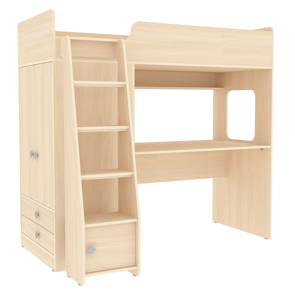Кровать чердак Л-Ф607.1 – великолепный комплект мебели, решение для площади малых габаритов, экономия пространства. Комплект занимает немного места - решение для площади малых габаритов, экономия пространства. Кровать чердак со спальным местом 1750×750 или большим 1900х750 Высота кровати чердака 1677 мм. Учебная зона со столом под спальным местом открывает возможности для письменных работ, а также здесь удобно расположить ноутбук. Вместительный шкаф для хранения одежды, белья, игрушек или иных вещей. Внизу шкафа располагаются выкатные ящики, в которых можно хранить отдельно мелкие предметы. Расположение ящиков позволяет ребенку легко извлекать необходимые вещи самостоятельно. Световое окно прямоугольной формы - дополнительное освещение, элемент для игры и возможность родителям наблюдать за ребенком. В комплект входит прямая лестница, она имеет место для хранения, с дверкой и ручкой плавной формы, без острых углов. Мягкий противоударный кант – дополнительная безопасность для детей.Все цветные фасады со светло-бежевой кромкой. Комплект может быть собран как на левую, так и на правую сторону.Характеристики