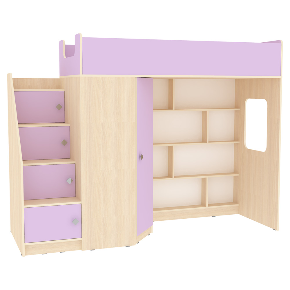 Кровать чердак Л-В602.3 – великолепный комплект мебели, решение для площади малых габаритов, экономия пространства. Комплект занимает немного места - решение для площади малых габаритов, экономия пространства. Высота кровати чердака 1677 мм. Под спальным местом располагается игровая зона – свой уголок для ребенка. В игровой зоне располагается стеллаж, отлично подходящий для хранения игрушек. Это очень удобно для поддержания порядка и сортировки предметов. Вместительный угловой шкаф для хранения одежды, белья, игрушек или иных вещей. Световое окно прямоугольной формы - дополнительное освещение, элемент для игры и возможность родителям наблюдать за ребенком. Интегрированная угловая лестница оснащена боковым бортиком и местами для хранения с ручками плавной формы, без острых углов. Мягкий противоударный кант – дополнительная безопасность для детей.Все цветные фасады со светло-бежевой кромкой. По вашему выбору комплект может быть собран как на левую, так и на правую сторону.Характеристики