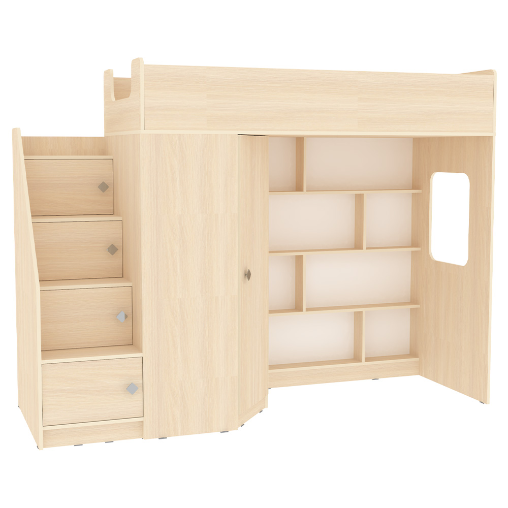 Кровать чердак Л-В602.3 – великолепный комплект мебели, решение для площади малых габаритов, экономия пространства. Комплект занимает немного места - решение для площади малых габаритов, экономия пространства. Высота кровати чердака 1677 мм. Под спальным местом располагается игровая зона – свой уголок для ребенка. В игровой зоне располагается стеллаж, отлично подходящий для хранения игрушек. Это очень удобно для поддержания порядка и сортировки предметов. Вместительный угловой шкаф для хранения одежды, белья, игрушек или иных вещей. Световое окно прямоугольной формы - дополнительное освещение, элемент для игры и возможность родителям наблюдать за ребенком. Интегрированная угловая лестница оснащена боковым бортиком и местами для хранения с ручками плавной формы, без острых углов. Мягкий противоударный кант – дополнительная безопасность для детей.Все цветные фасады со светло-бежевой кромкой. По вашему выбору комплект может быть собран как на левую, так и на правую сторону.Характеристики