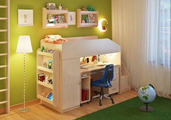 Кровать чердак Л-11.4 со столом и полками – отличный комплект по приятной цене.Целая комната в одном комплекте!. Комплект занимает немного места - отличное решение для площади малых габаритов,экономия пространства. Кровать-чердак с большим спальным местом размером 1800х800. Под спальным местом располагается игровая зона – свой уголок,словно домик для ребенка. В игровой зоне располагается стеллаж,состоящий из трех полок.Стеллаж отлично подходит для хранения игрушек,удобен для поддержания порядка и сортировки предметов. Угловая лестница-стеллаж из трех ступенек надёжна и безопасна.В комплект входят фасады,поэтому стеллаж состоит из трёх полноценных полок с дверками - удобное дополнительное место для хранения вещей. Вместительный шкаф с четырьмя полками и штангой для хранения одежды,белья, игрушек или иных вещей. Удобный письменный стол Л-01 для занятий оборудован колёсиками,легко перемещается по полу,задвигается и выдвигается.Три выкатных ящика стола обеспечат удобное хранение канцелярии,письменных,учебных и прочих принадлежностей.На столе оптимально располагается стационарный компьютер,есть отсек для системного блока и выкатная полка для клавиатуры и дополнительная полочка для мелочей.Стол Л-01 идеально помещается в пространство под спальным местом кровати Легенда-11. Две оригинальные двухъярусные полки Л-02 подойдут для хранения как небольших,так и высоких предметов.Дополнительный бортик защищает содержимое полки от падений. Полка Л-04 с четырьмя ярусами – самая большая и вместительная полка в нашей линейке,в четыре яруса помещается невероятно много вещей.Полка идеально подходит по размерам к боковой стенке кровати,что позволяет увеличить пространство для хранения без ущерба для свободной площади.Каждый ярус оборудован бортиком,который защищает содержимое полки от падений. Широкая лестница со ступенями из массива сосны – устойчивость и надёжность. Световое окно - дополнительное освещение,элемент для игры и возможность родителям наблюдать за ребенком. Модель универсальна - сторона определяется при сборке. Матрасы в комплект не входят - приобретаются отдельно.Характеристики
