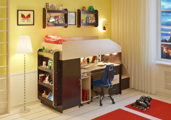 Кровать чердак Л-11.4 со столом и полками – отличный комплект по приятной цене.Целая комната в одном комплекте!. Комплект занимает немного места - отличное решение для площади малых габаритов,экономия пространства. Кровать-чердак с большим спальным местом размером 1800х800. Под спальным местом располагается игровая зона – свой уголок,словно домик для ребенка. В игровой зоне располагается стеллаж,состоящий из трех полок.Стеллаж отлично подходит для хранения игрушек,удобен для поддержания порядка и сортировки предметов. Угловая лестница-стеллаж из трех ступенек надёжна и безопасна.В комплект входят фасады,поэтому стеллаж состоит из трёх полноценных полок с дверками - удобное дополнительное место для хранения вещей. Вместительный шкаф с четырьмя полками и штангой для хранения одежды,белья, игрушек или иных вещей. Удобный письменный стол Л-01 для занятий оборудован колёсиками,легко перемещается по полу,задвигается и выдвигается.Три выкатных ящика стола обеспечат удобное хранение канцелярии,письменных,учебных и прочих принадлежностей.На столе оптимально располагается стационарный компьютер,есть отсек для системного блока и выкатная полка для клавиатуры и дополнительная полочка для мелочей.Стол Л-01 идеально помещается в пространство под спальным местом кровати Легенда-11. Две оригинальные двухъярусные полки Л-02 подойдут для хранения как небольших,так и высоких предметов.Дополнительный бортик защищает содержимое полки от падений. Полка Л-04 с четырьмя ярусами – самая большая и вместительная полка в нашей линейке,в четыре яруса помещается невероятно много вещей.Полка идеально подходит по размерам к боковой стенке кровати,что позволяет увеличить пространство для хранения без ущерба для свободной площади.Каждый ярус оборудован бортиком,который защищает содержимое полки от падений. Широкая лестница со ступенями из массива сосны – устойчивость и надёжность. Световое окно - дополнительное освещение,элемент для игры и возможность родителям наблюдать за ребенком. Модель универсальна - сторона определяется при сборке. Матрасы в комплект не входят - приобретаются отдельно.Характеристики