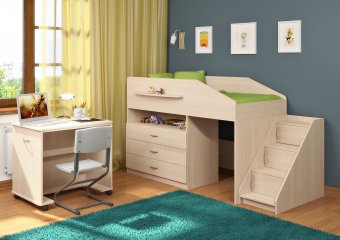 Г отовая комната для Вашего ребенка, которая совмещает в себе спальное место, вместительное место для одежды, выдвижной стол и игровую зону. Большое количество оттенков помогут подобрать мебель по вкусу ребенку и интерьеру комнаты, а большое разнообразие комплектаций и размеров поможет вписать детскую комнату даже в любую малогабаритную квартиру. Комплектация: • кровать-чердак (спальное место: 80 х 160 см., без матраса), размеры (Д*Г*В): 1652*846*1145 мм • встроенный комод, размеры(Д*Г*В): 1010*486*770 мм • встроенный пенал, размеры(Д*Г*В): 360*500*770 мм • маленький письменный стол, размеры(Д*Г*В): 800*600*735 мм • лестница угловая с фасадами, размеры(Д*Г*В): 420*812*770 мм Основные параметры: • Габариты(Д*Г*В):2072*956*1145 мм • Высота борта: 355 мм • Ширина лестницы: 420 мм • Выступ лестницы: 812 мм • Рекомендуемая высота матраса: 50-150 мм Модель универсальна - сторона определяется при сборке. Матрасы в комплект не входят - приобретаются отдельно.Характеристики