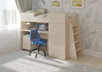 Кровать чердакЛ-3.13 – замечательный комплект мебели со столом. Комплектзанимает немного места- решение для площади малых габаритов,экономия пространства. Кровать с большимспальным местом 1800х800. Под спальным местом располагаетсяигровая зона– свой уголок для ребенка. В игровой зоне располагаетсястеллаж,отлично подходящий для хранения игрушек.Стеллажсостоит из трех полок,разделенных на две секции – удобно для поддержания порядка и сортировки предметов. Вместительный шкафдля хранения одежды,белья,игрушек или иных вещей.Внизу шкафа располагаетсявыкатной ящик,в котором можно хранить отдельно мелкие предметы.Расположение ящика позволяет ребенку легко извлекать необходимые вещи самостоятельно. В комплект входиткомфортныйписьменный стол,оборудованный поворотными колесами.Стол легко перемещается по полу,задвигается и выдвигается.Три выкатных ящика столаобеспечатудобное хранение канцелярии,письменных,учебных и прочих принадлежностей.Над ящикамиоткрытая полка для мелочей,которые будут всегда под рукой.Стол идеально помещается под кроватью,поэтому его можно «спрятать» в случае необходимости. Световое окно- дополнительное освещение,элемент для игры и возможность родителям наблюдать за ребенком. Широкая лестница из массива сосны– устойчивость и надёжность. Мягкий противоударный кант– дополнительная безопасность для детей. Модель универсальна - сторона определяется при сборке. Матрасы в комплект не входят - приобретаются отдельно.Характеристики