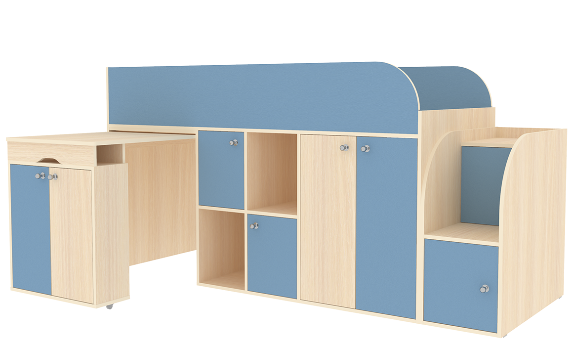 Кровать чердак Малыш 3 - замечательный вариант компактного размещения спального места, рабочей зоны и мест для хранения вещей. В кровати -чердаке Малыш 3 все эти составляющие объединены в общую группу. Выкатной стол, открытые и закрытые полки, шкаф для одежды и лестница - комод разместят необходимые вещи ребенка. Спальное место с бортиками защитит от падения. Эта компактная и многофункциональная детская кровать станет великолепным решением для небольшой детской комнаты. На цветных фасадах светло-бежевая кромка. Модель универсальна - сторона определяется при сборке. Матрасы в комплект не входят - приобретаются отдельно.Характеристики