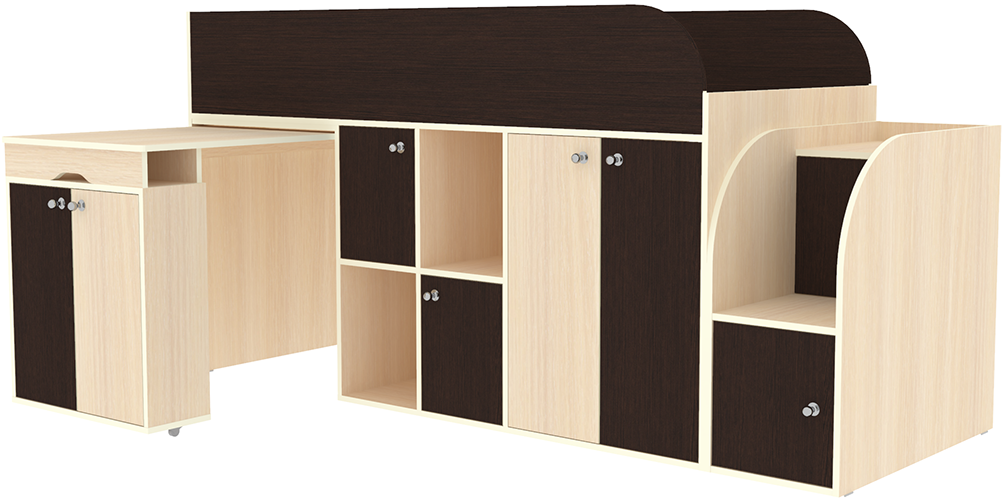 Кровать чердак Малыш 3 - замечательный вариант компактного размещения спального места, рабочей зоны и мест для хранения вещей. В кровати -чердаке Малыш 3 все эти составляющие объединены в общую группу. Выкатной стол, открытые и закрытые полки, шкаф для одежды и лестница - комод разместят необходимые вещи ребенка. Спальное место с бортиками защитит от падения. Эта компактная и многофункциональная детская кровать станет великолепным решением для небольшой детской комнаты. На цветных фасадах светло-бежевая кромка. Модель универсальна - сторона определяется при сборке. Матрасы в комплект не входят - приобретаются отдельно.Характеристики