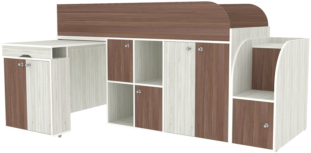 Кровать чердак Малыш 3 - замечательный вариант компактного размещения спального места, рабочей зоны и мест для хранения вещей. В кровати -чердаке Малыш 3 все эти составляющие объединены в общую группу. Выкатной стол, открытые и закрытые полки, шкаф для одежды и лестница - комод разместят необходимые вещи ребенка. Спальное место с бортиками защитит от падения. Эта компактная и многофункциональная детская кровать станет великолепным решением для небольшой детской комнаты. На цветных фасадах светло-бежевая кромка. Модель универсальна - сторона определяется при сборке. Матрасы в комплект не входят - приобретаются отдельно.Характеристики