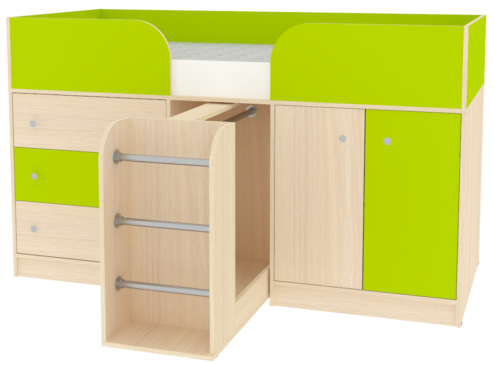 Кровать чердак Малыш 4 решает проблему малого пространства сочетая в себе целый ряд функций: кровать, большой шкафчик для вещей или игрушек, комод с 3-я глубокими ящиками, а так же выдвижную лестницу-гардероб. Мебель изготовлена из ламинированного ДСП, с использованием кромки АБС, что позволяет продлить срок службы изделию и сохранить внешний вид. На цветных фасадах светло-бежевая кромка. Являясь малогабаритной, компактной и многофункциональнойкроваткой Малыш 4станет великолепным решением для небольшой детской комнаты. У мебелидля малышей нет острых углов, о которые ребенок может больно удариться. Кровати-чердаки обязательно оборудованы ограничителями, которые не дадут ребенку случайно упасть с кровати. разумеется, особое внимание компанияуделяет прочности и надежности производимой мебели. Модель универсальна - сторона определяется при сборке. Матрасы в комплект не входят - приобретаются отдельно.Характеристики