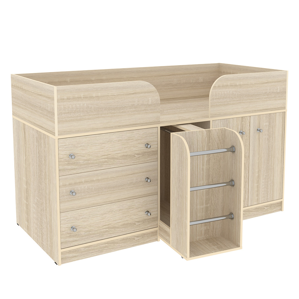 Кровать чердак Малыш 4 решает проблему малого пространства сочетая в себе целый ряд функций: кровать, большой шкафчик для вещей или игрушек, комод с 3-я глубокими ящиками, а так же выдвижную лестницу-гардероб. Мебель изготовлена из ламинированного ДСП, с использованием кромки АБС, что позволяет продлить срок службы изделию и сохранить внешний вид. На цветных фасадах светло-бежевая кромка. Являясь малогабаритной, компактной и многофункциональнойкроваткой Малыш 4станет великолепным решением для небольшой детской комнаты. У мебелидля малышей нет острых углов, о которые ребенок может больно удариться. Кровати-чердаки обязательно оборудованы ограничителями, которые не дадут ребенку случайно упасть с кровати. разумеется, особое внимание компанияуделяет прочности и надежности производимой мебели. Модель универсальна - сторона определяется при сборке. Матрасы в комплект не входят - приобретаются отдельно.Характеристики