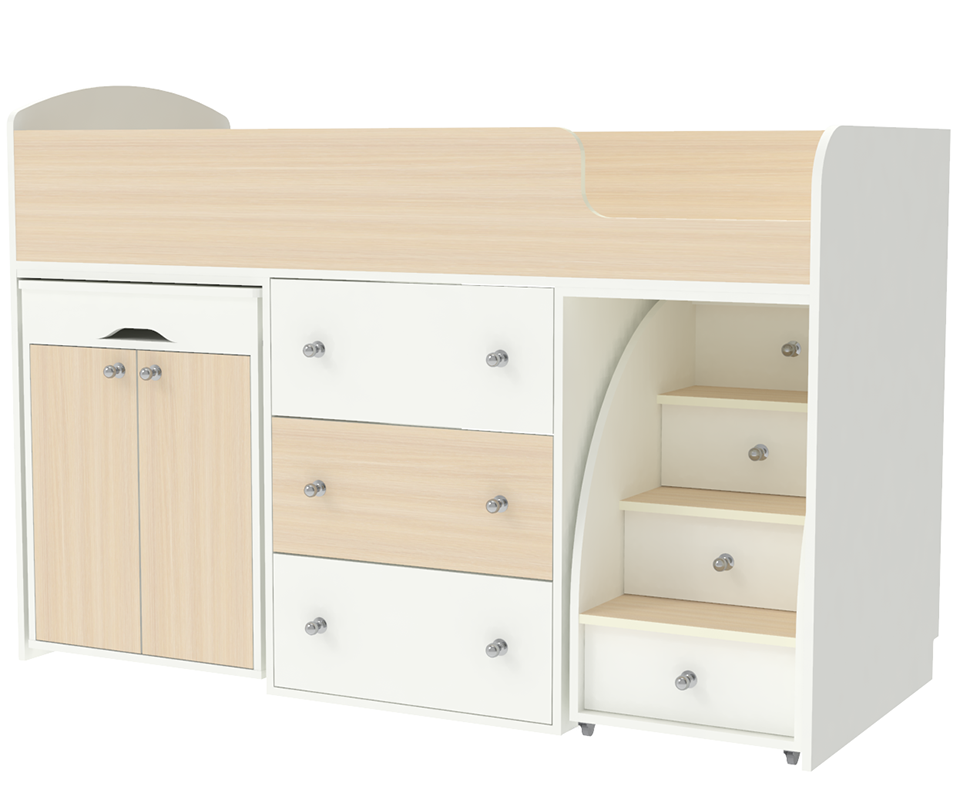 Кровать чердак Малыш - это многофункциональный спальный комплекс, включающий детскую кровать Малыш на «чердаке», комод, выдвижной стол, лестницу с выдвижными ящиками и отделение для игрушек на колёсах, которое легко убирается под кровать. Удобное спальное место наверху со специальным ограждением для безопасности сделает сон комфортным.При желании можно нарастить бортик. Дно кровати - щит ЛДСП. Матрас (пружинный блок,ватин,войлок,жаккард) можно заказать отдельно. Рекомендованная высота матрасов - 10- 15 см (бортик кровати - 27 см). Размер спального места (матраса) 70х160 см. Кровать-чердак Малышупакована в 5 коробок, вес 121 кг., объем 0,35 м3. Детская Малыш универсальна и может быть собрана в лево- и правостороннем вариантах Глубина ящиков в лесенке - 300мм Модель универсальна - сторона определяется при сборке. На цветных фасадах светло-бежевая кромка. Матрасы в комплект не входят - приобретаются отдельно.Характеристики