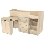 Кровать чердак Малыш - это многофункциональный спальный комплекс, включающий детскую кровать Малыш на «чердаке», комод, выдвижной стол, лестницу с выдвижными ящиками и отделение для игрушек на колёсах, которое легко убирается под кровать. Удобное спальное место наверху со специальным ограждением для безопасности сделает сон комфортным.При желании можно нарастить бортик. Дно кровати - щит ЛДСП. Матрас (пружинный блок,ватин,войлок,жаккард) можно заказать отдельно. Рекомендованная высота матрасов - 10- 15 см (бортик кровати - 27 см). Размер спального места (матраса) 70х160 см. Кровать-чердак Малышупакована в 5 коробок, вес 121 кг., объем 0,35 м3. Детская Малыш универсальна и может быть собрана в лево- и правостороннем вариантах Глубина ящиков в лесенке - 300мм Модель универсальна - сторона определяется при сборке. На цветных фасадах светло-бежевая кромка. Матрасы в комплект не входят - приобретаются отдельно.Характеристики