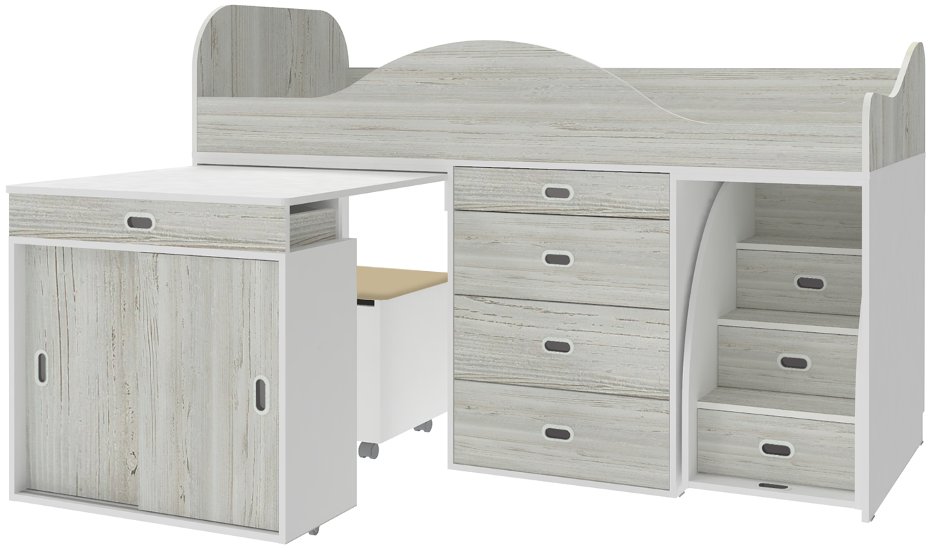 Кровать чердак Малыш Люкс - удобная кроватка, вместительный комод, выдвижной столик с ящиком и торцевым шкафом, а также удобная банкетка. Ящик для игрушек может использоваться как пуфик, он может выполнять функцию стульчика с мягким сидением в виде открывающейся крышки обтянутой практичной винилис кожей. Торцевой выдвижной ящик с разделителем секций для разнообразных мелочей. В передней части стола встроен вместительный шкафчик-купе с раздвижными дверцами. В верхнюю часть комода добавлен широкий и практичный ящик для письменных принадлежностей. На всех фасадах используются удобные пластиковые врезные ручки. Все выдвижные ящики на шариковых направляющих полного выдвижения. На цветных фасадах светло-бежевая кромка. Модель универсальна - сторона определяется при сборке. Матрасы в комплект не входят - приобретаются отдельно.Характеристики