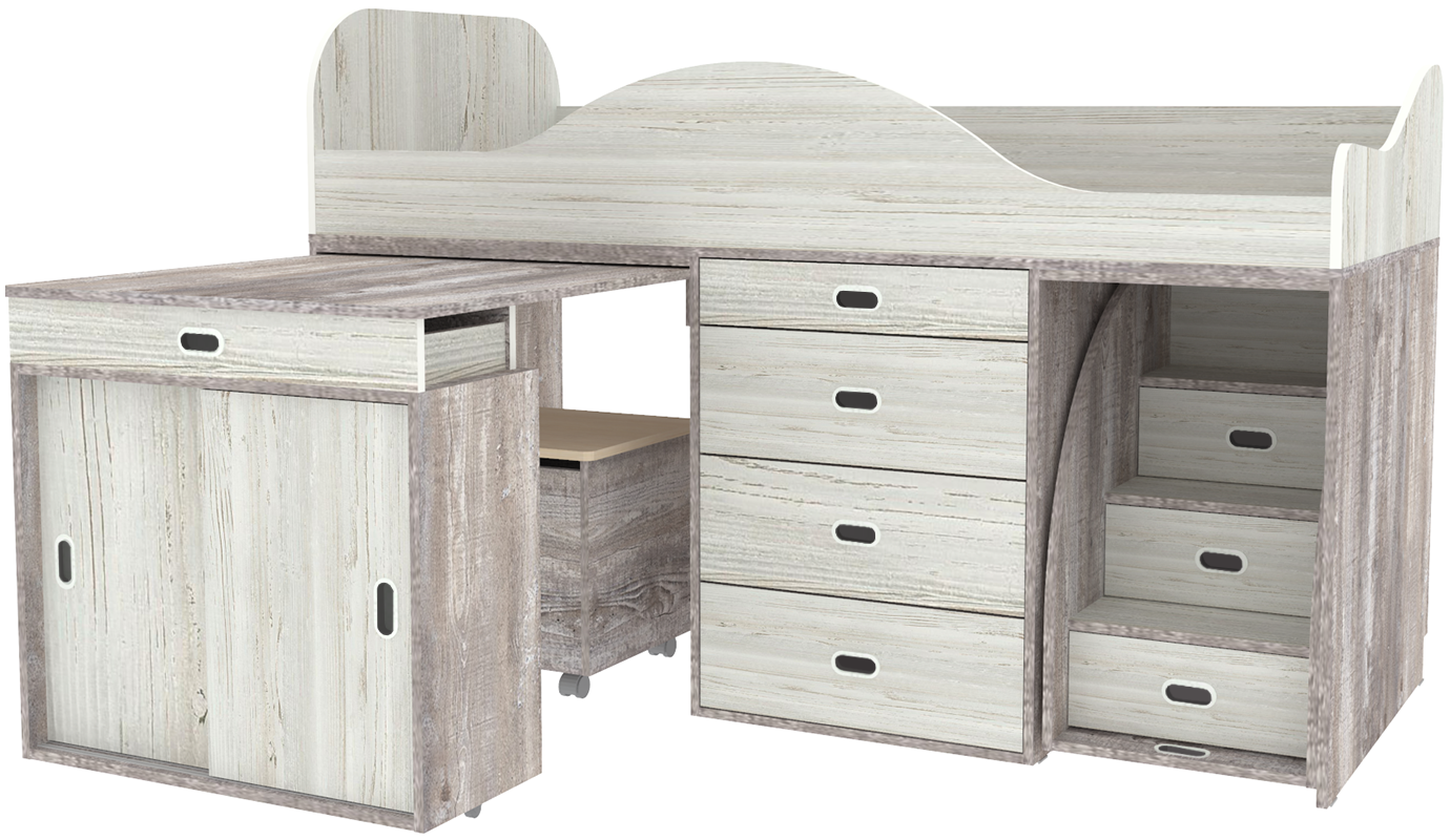 Кровать чердак Малыш Люкс - удобная кроватка, вместительный комод, выдвижной столик с ящиком и торцевым шкафом, а также удобная банкетка. Ящик для игрушек может использоваться как пуфик, он может выполнять функцию стульчика с мягким сидением в виде открывающейся крышки обтянутой практичной винилис кожей. Торцевой выдвижной ящик с разделителем секций для разнообразных мелочей. В передней части стола встроен вместительный шкафчик-купе с раздвижными дверцами. В верхнюю часть комода добавлен широкий и практичный ящик для письменных принадлежностей. На всех фасадах используются удобные пластиковые врезные ручки. Все выдвижные ящики на шариковых направляющих полного выдвижения. На цветных фасадах светло-бежевая кромка. Модель универсальна - сторона определяется при сборке. Матрасы в комплект не входят - приобретаются отдельно.Характеристики
