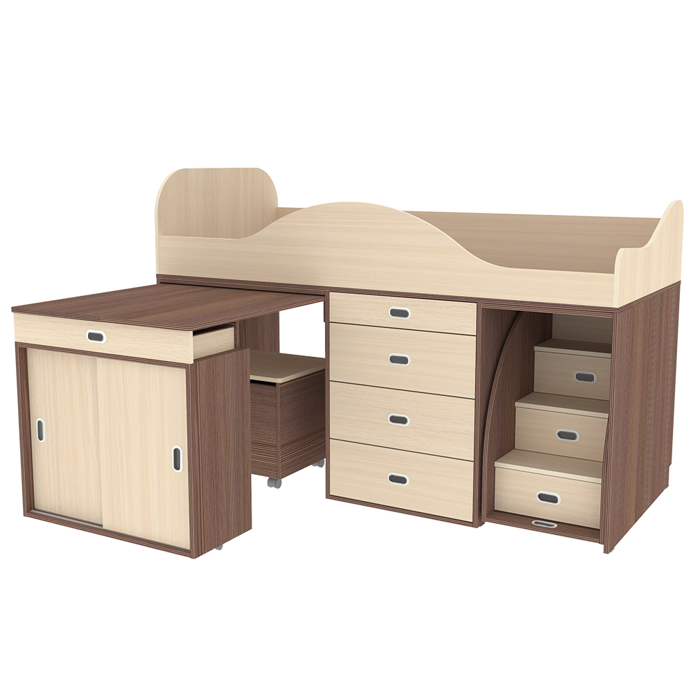 Кровать чердак Малыш Люкс - удобная кроватка, вместительный комод, выдвижной столик с ящиком и торцевым шкафом, а также удобная банкетка. Ящик для игрушек может использоваться как пуфик, он может выполнять функцию стульчика с мягким сидением в виде открывающейся крышки обтянутой практичной винилис кожей. Торцевой выдвижной ящик с разделителем секций для разнообразных мелочей. В передней части стола встроен вместительный шкафчик-купе с раздвижными дверцами. В верхнюю часть комода добавлен широкий и практичный ящик для письменных принадлежностей. На всех фасадах используются удобные пластиковые врезные ручки. Все выдвижные ящики на шариковых направляющих полного выдвижения. На цветных фасадах светло-бежевая кромка. Модель универсальна - сторона определяется при сборке. Матрасы в комплект не входят - приобретаются отдельно.Характеристики