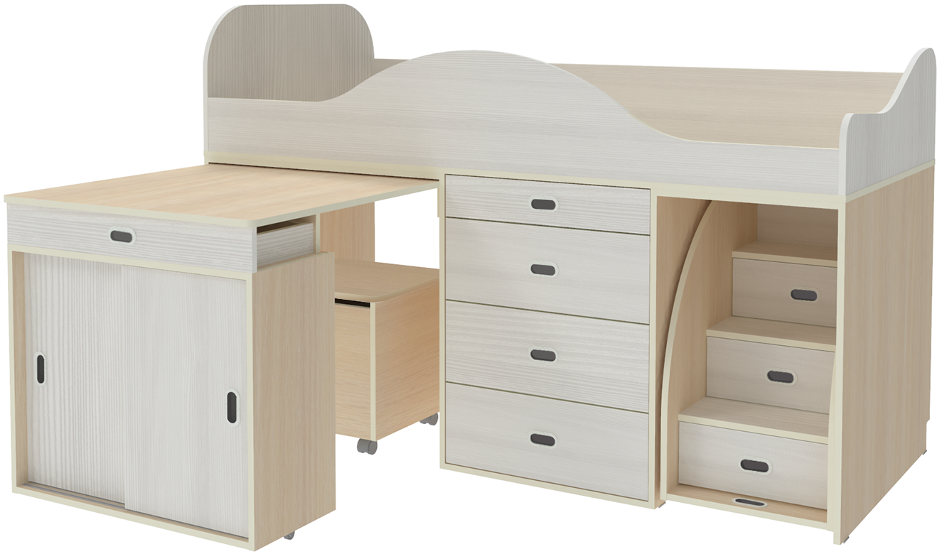 Кровать чердак Малыш Люкс - удобная кроватка, вместительный комод, выдвижной столик с ящиком и торцевым шкафом, а также удобная банкетка. Ящик для игрушек может использоваться как пуфик, он может выполнять функцию стульчика с мягким сидением в виде открывающейся крышки обтянутой практичной винилис кожей. Торцевой выдвижной ящик с разделителем секций для разнообразных мелочей. В передней части стола встроен вместительный шкафчик-купе с раздвижными дверцами. В верхнюю часть комода добавлен широкий и практичный ящик для письменных принадлежностей. На всех фасадах используются удобные пластиковые врезные ручки. Все выдвижные ящики на шариковых направляющих полного выдвижения. На цветных фасадах светло-бежевая кромка. Модель универсальна - сторона определяется при сборке. Матрасы в комплект не входят - приобретаются отдельно.Характеристики