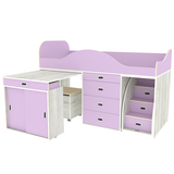 Кровать чердак Малыш Люкс - удобная кроватка, вместительный комод, выдвижной столик с ящиком и торцевым шкафом, а также удобная банкетка. Ящик для игрушек может использоваться как пуфик, он может выполнять функцию стульчика с мягким сидением в виде открывающейся крышки обтянутой практичной винилис кожей. Торцевой выдвижной ящик с разделителем секций для разнообразных мелочей. В передней части стола встроен вместительный шкафчик-купе с раздвижными дверцами. В верхнюю часть комода добавлен широкий и практичный ящик для письменных принадлежностей. На всех фасадах используются удобные пластиковые врезные ручки. Все выдвижные ящики на шариковых направляющих полного выдвижения. На цветных фасадах светло-бежевая кромка. Модель универсальна - сторона определяется при сборке. Матрасы в комплект не входят - приобретаются отдельно.Характеристики