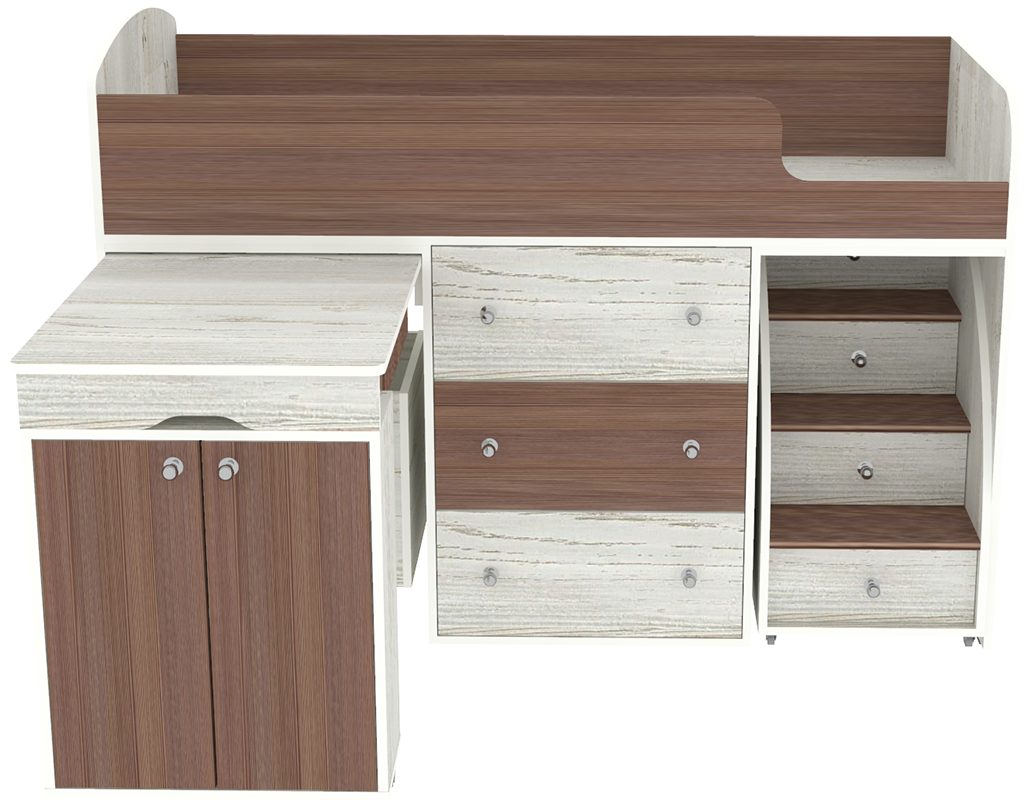 Кровать чердак Малыш - это многофункциональный спальный комплекс, включающий детскую кровать Малыш на «чердаке», комод, выдвижной стол, лестницу с выдвижными ящиками и отделение для игрушек на колёсах, которое легко убирается под кровать. Удобное спальное место наверху со специальным ограждением для безопасности сделает сон комфортным.При желании можно нарастить бортик. Дно кровати - щит ЛДСП. Матрас (пружинный блок,ватин,войлок,жаккард) можно заказать отдельно. Рекомендованная высота матрасов - 10- 15 см (бортик кровати - 27 см). Размер спального места (матраса) 70х160 см. Кровать-чердак Малышупакована в 5 коробок, вес 121 кг., объем 0,35 м3. Детская Малыш универсальна и может быть собрана в лево- и правостороннем вариантах Глубина ящиков в лесенке - 300мм Модель универсальна - сторона определяется при сборке. На цветных фасадах светло-бежевая кромка. Матрасы в комплект не входят - приобретаются отдельно.Характеристики