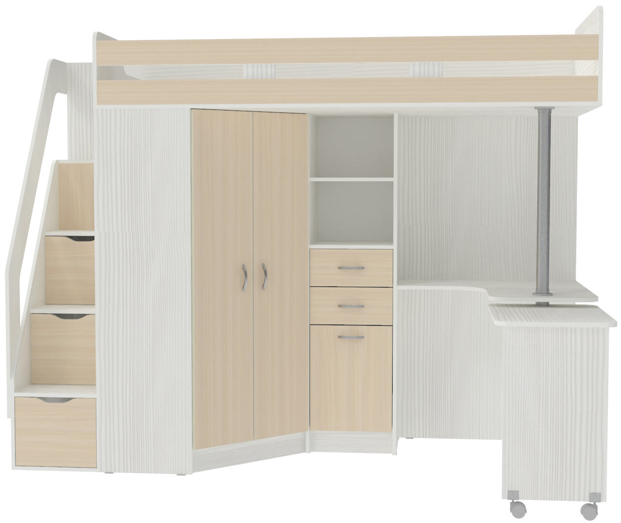 Кровать чердак Мийа - уникальная модель, которая непременно понравится своей комфортностью, оригинальностью и многофункциональностью всем членам семьи. Несмотря на обилие функциональных предметов, этот комплекс выглядит аккуратно. Подойдет такой комплект для мальчика и девочки, ведь разнообразие расцветок может быть составлено в соответствии с вкусовыми предпочтениями ребенка и выбранной тематикой. Модель универсальна - сторона определяется при сборке. Цветные фасады со светло-бежевой кромкой. Матрасы в комплект не входят - приобретаются отдельно.Характеристики