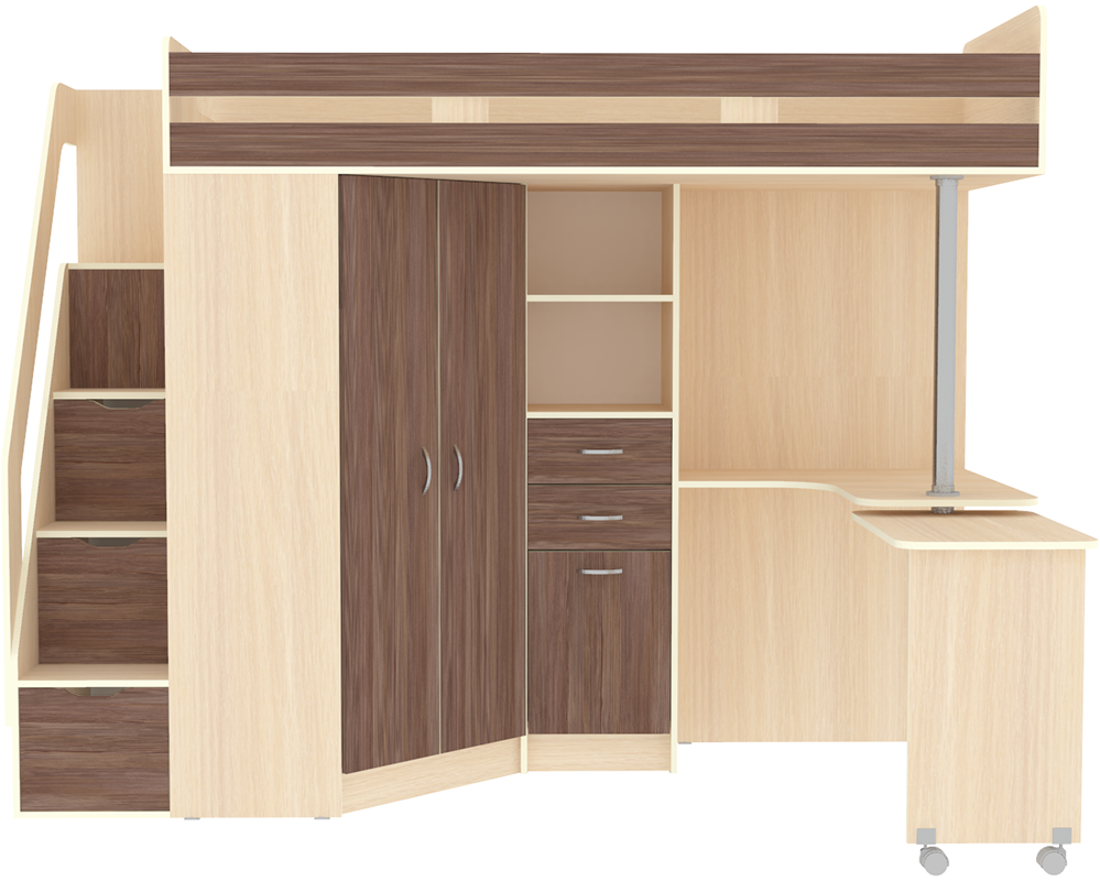 Кровать чердак Мийа - уникальная модель, которая непременно понравится своей комфортностью, оригинальностью и многофункциональностью всем членам семьи. Несмотря на обилие функциональных предметов, этот комплекс выглядит аккуратно. Подойдет такой комплект для мальчика и девочки, ведь разнообразие расцветок может быть составлено в соответствии с вкусовыми предпочтениями ребенка и выбранной тематикой. Модель универсальна - сторона определяется при сборке. Цветные фасады со светло-бежевой кромкой. Матрасы в комплект не входят - приобретаются отдельно.Характеристики