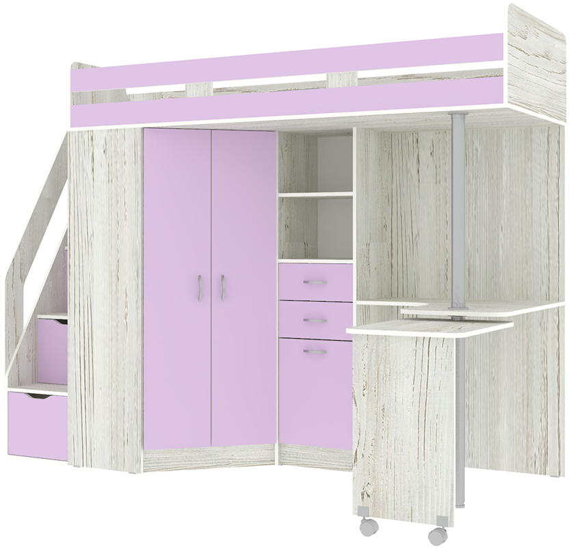 Кровать чердак Мийа - уникальная модель, которая непременно понравится своей комфортностью, оригинальностью и многофункциональностью всем членам семьи. Несмотря на обилие функциональных предметов, этот комплекс выглядит аккуратно. Подойдет такой комплект для мальчика и девочки, ведь разнообразие расцветок может быть составлено в соответствии с вкусовыми предпочтениями ребенка и выбранной тематикой. Модель универсальна - сторона определяется при сборке. Цветные фасады со светло-бежевой кромкой. Матрасы в комплект не входят - приобретаются отдельно.Характеристики