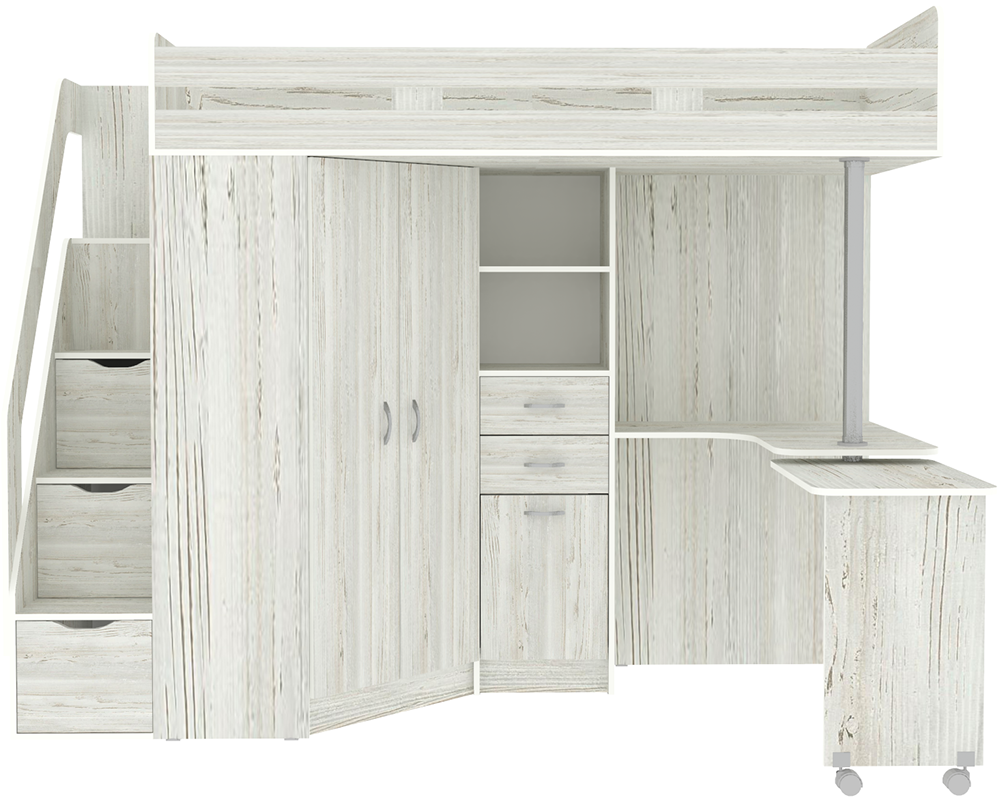 Кровать чердак Мийа - уникальная модель, которая непременно понравится своей комфортностью, оригинальностью и многофункциональностью всем членам семьи. Несмотря на обилие функциональных предметов, этот комплекс выглядит аккуратно. Подойдет такой комплект для мальчика и девочки, ведь разнообразие расцветок может быть составлено в соответствии с вкусовыми предпочтениями ребенка и выбранной тематикой. Модель универсальна - сторона определяется при сборке. Цветные фасады со светло-бежевой кромкой. Матрасы в комплект не входят - приобретаются отдельно.Характеристики