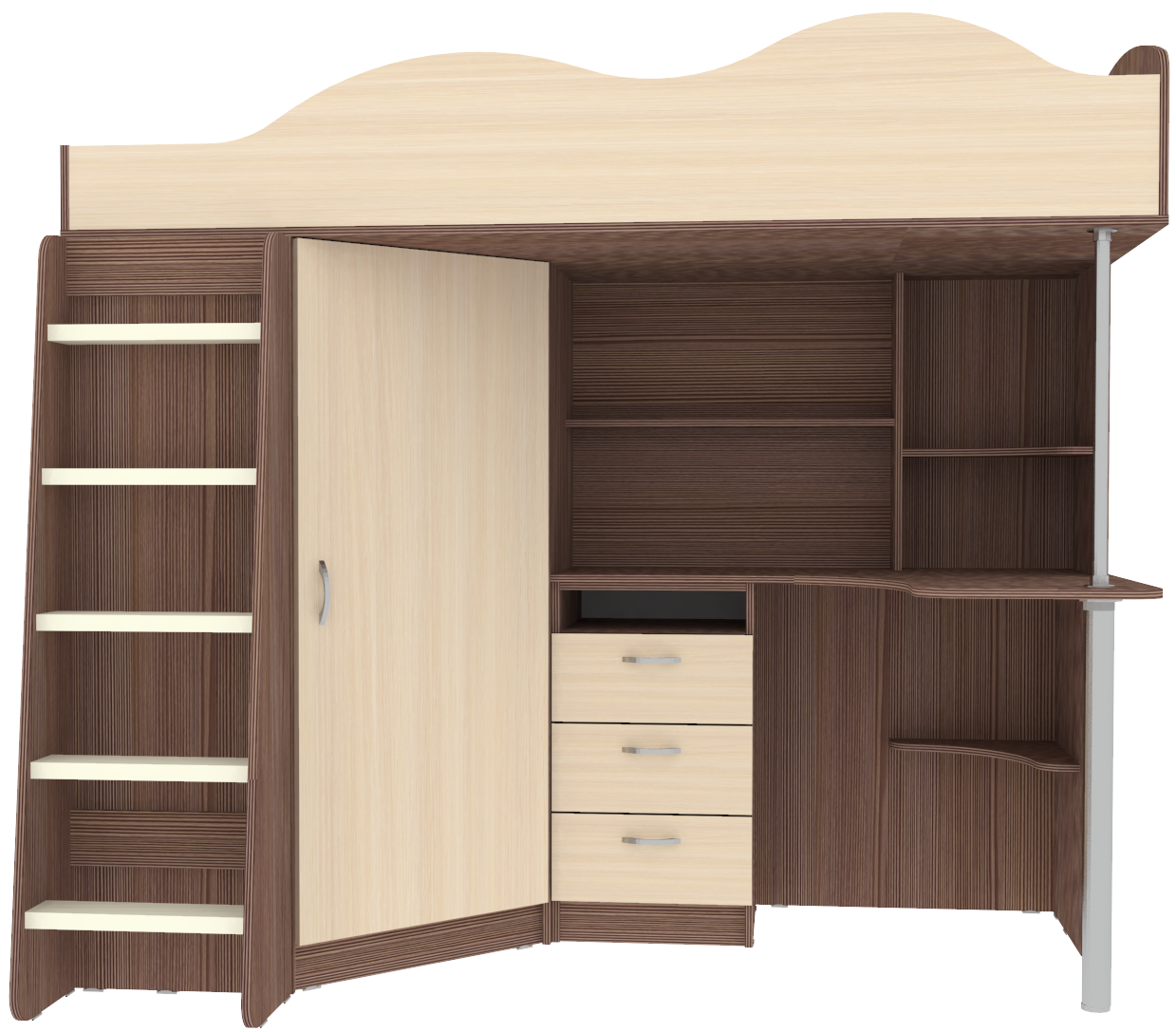 Кровать чердак Пионер включает в себя: Компьютерный стол с множеством стеллажей Тумба с ящиками для письменных принадлежностей Небольшой, но глубокий шкафчик для одежды и обуви, стоящий под углом оснащён перекладиной для вешалок и полочками Деревянная лестница Бортик среднего размера, сделанный в форме волн, защитит ребёнка от случайных падений Качественные материалы и удачная комбинация цвета фасадов и основной конструкции, обеспечат безопасность, долговечность и сохранят привлекательный внешний вид. Сборка универсальная. Матрасы в стоимость не входят.Ваш ребенок по достоинству оценит комфорт, который несет вам кровать-чердак с рабочей зоной Пионер. Кровать чердак Пионер- это удобная и компактная мини детская комната для Вашего ребенка со спальным местом наверху и рабочей зоной внизу. Матрас для кровати вы можете приобрести отдельно в разделедетских матрасов.. на цветных фасадах светло-бежевая кромка. *Предприятие-изготовитель оставляет за собой право вносить изменения в конструкцию изделия с целью улучшения технологических и эксплутационных свойств мебели. *Ограничение по нагрузке на лестницу до 75 кг.