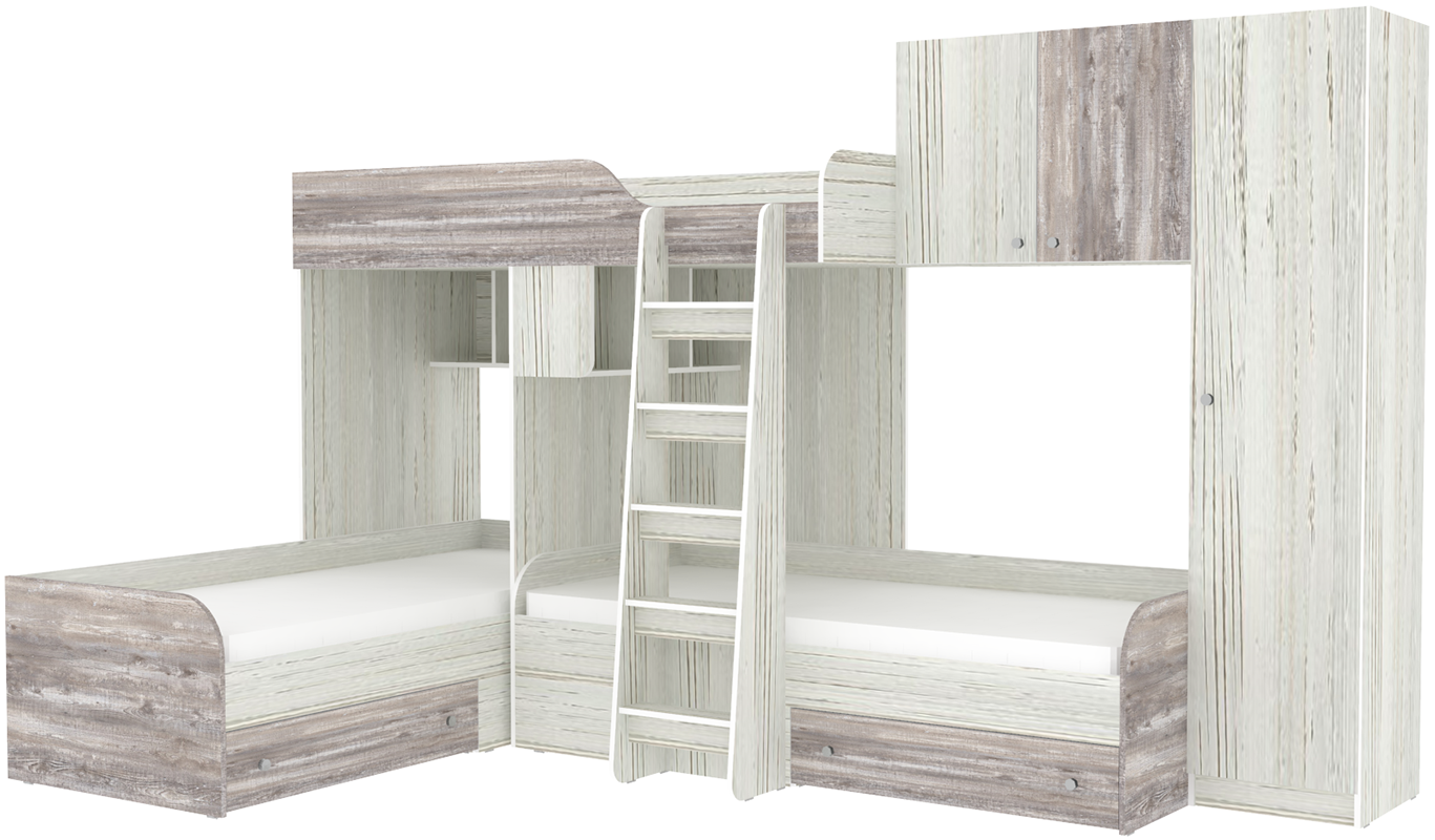 Детская двухъярусная кровать Трио-2 со шкафом— отличный вариант если в семье трое детей, а место в комнате мало. Плюсы данной кровати - наличие трёх спальных мест, шкафа и антресольной полки. Цвет кромки на цветных фасадах - светло-бежевый.- спальное место: нижние 1900 х 800 мм, верхнее 1900 на 800 мм