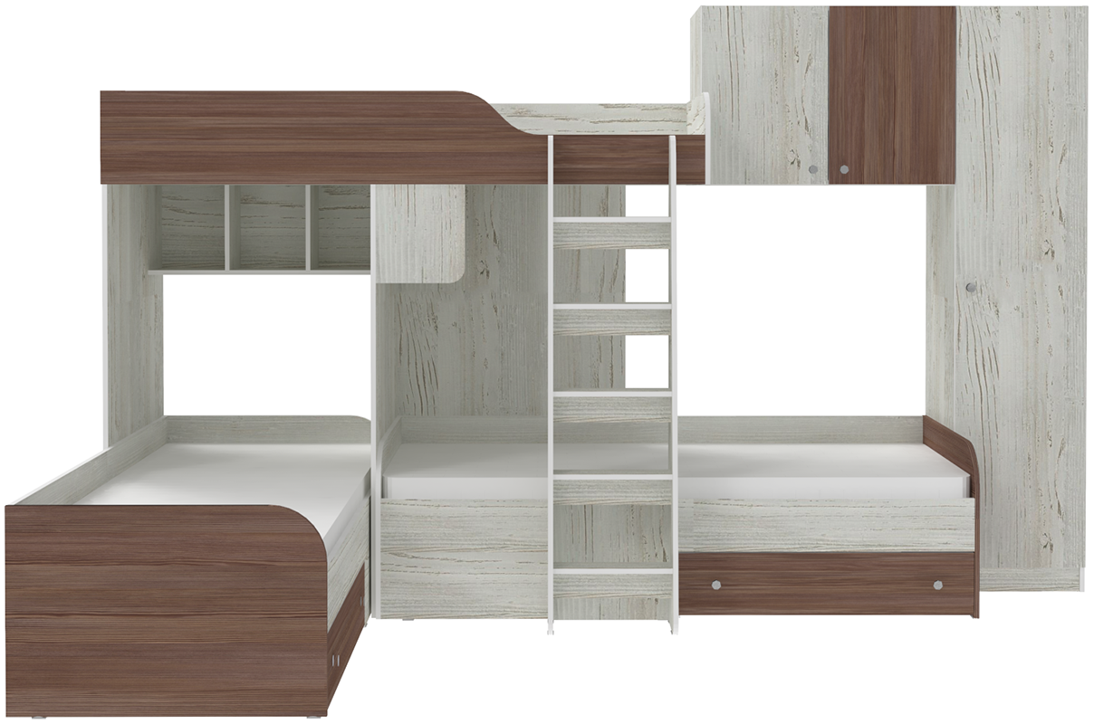 Детская двухъярусная кровать Трио-2 со шкафом— отличный вариант если в семье трое детей, а место в комнате мало. Плюсы данной кровати - наличие трёх спальных мест, шкафа и антресольной полки. Цвет кромки на цветных фасадах - светло-бежевый.- спальное место: нижние 1900 х 800 мм, верхнее 1900 на 800 мм