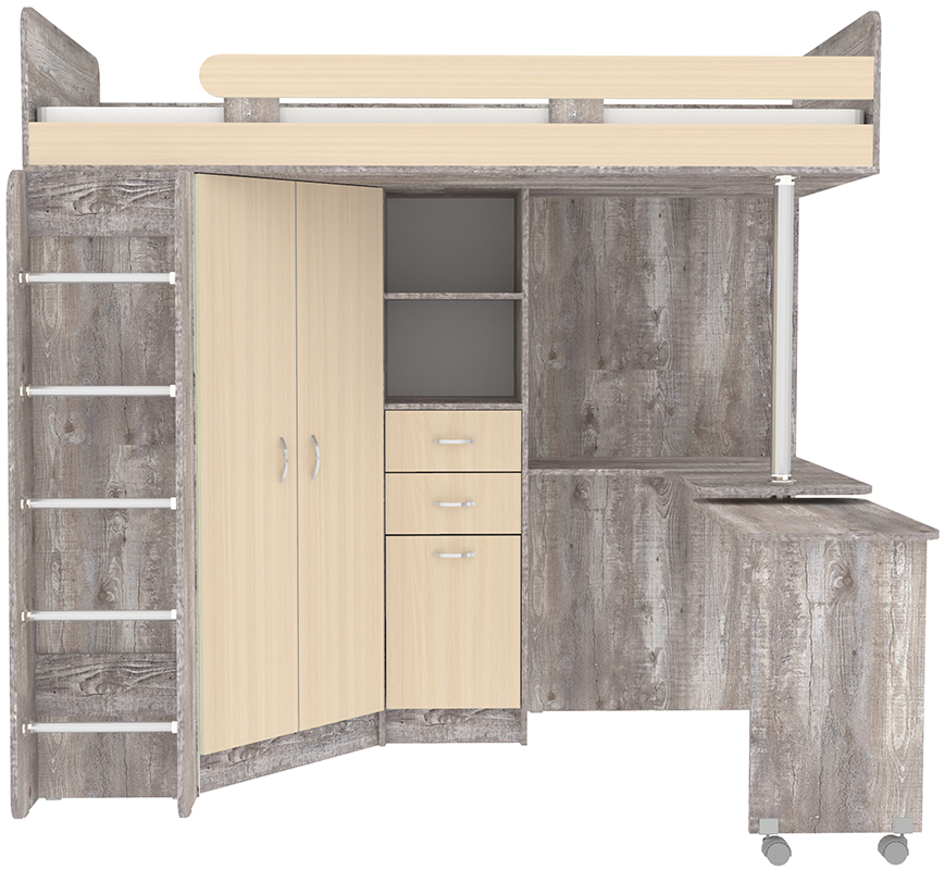 Кровать чердак Юниор 3 - уникальная модель, которая непременно понравится своей комфортностью, оригинальностью и многофункциональностью всем членам семьи. Несмотря на обилие функциональных предметов, этот комплекс выглядит аккуратно. Стильная и функциональная двухъярусная кровать для ваших детей, выполненная из качественных и натуральных материалов. Такая детская мебель является максимально удобной, соединяя в оригинальный комплект большое спальное место, удобное место для уроков и большой шкаф для одежды. Подойдет такой комплект для мальчика и девочки, ведь разнообразие расцветок может быть составлено в соответствии с вкусовыми предпочтениями ребенка и выбранной тематикой. Цветовое исполнение корпус: Венге, Дуб молочный, Белое дерево, Бодего темный, Белый, Винтерберг, Бетон. Цветовое исполнение фасады: Дуб молочный, Белое дерево, Белый, Бодего темный, Венге, Винтерберг, Бетон, Лайм, Светло Синий/Голубой, Розовый, Оранжевый, Ириc На цветных фасадах светло-бежевая кромка. Кровать-чердак Юниор 3 станет чудесным подарком для Вашего ребёнка.Характеристики