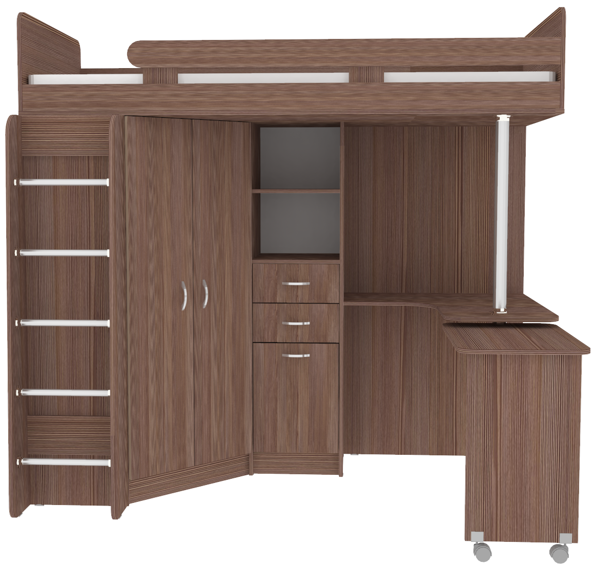Кровать чердак Юниор 3 - уникальная модель, которая непременно понравится своей комфортностью, оригинальностью и многофункциональностью всем членам семьи. Несмотря на обилие функциональных предметов, этот комплекс выглядит аккуратно. Стильная и функциональная двухъярусная кровать для ваших детей, выполненная из качественных и натуральных материалов. Такая детская мебель является максимально удобной, соединяя в оригинальный комплект большое спальное место, удобное место для уроков и большой шкаф для одежды. Подойдет такой комплект для мальчика и девочки, ведь разнообразие расцветок может быть составлено в соответствии с вкусовыми предпочтениями ребенка и выбранной тематикой. Цветовое исполнение корпус: Венге, Дуб молочный, Белое дерево, Бодего темный, Белый, Винтерберг, Бетон. Цветовое исполнение фасады: Дуб молочный, Белое дерево, Белый, Бодего темный, Венге, Винтерберг, Бетон, Лайм, Светло Синий/Голубой, Розовый, Оранжевый, Ириc На цветных фасадах светло-бежевая кромка. Кровать-чердак Юниор 3 станет чудесным подарком для Вашего ребёнка.Характеристики