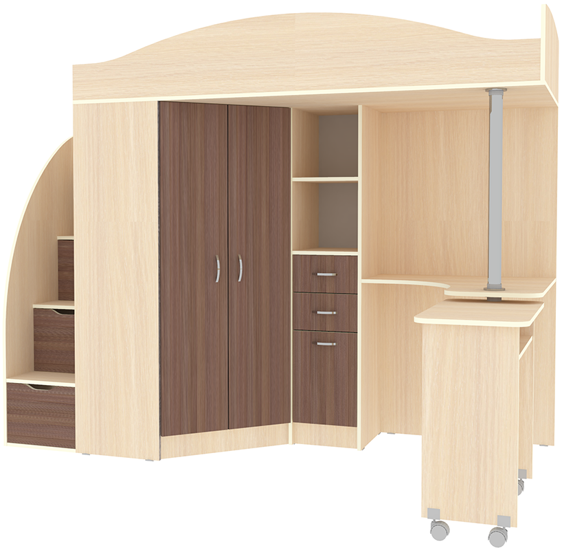 Кровать чердак Юниор 4 - уникальная модель, которая непременно понравится своей комфортностью, оригинальностью и вместительностью. Большое количество оттенков помогут подобрать мебель по вкусу ребенку и интерьеру комнаты. На цветных фасадах светло-бежевая кромка. Такая детская мебель является максимально удобной, соединяя в оригинальный комплект большое спальное место, удобное место для уроков и большой шкаф для одежды. Подойдет такой комплект для мальчика и девочки, ведь разнообразие расцветок может быть составлено в соответствии с вкусовыми предпочтениями ребенка и выбранной тематикой. Модель универсальна - сторона определяется при сборке. Матрасы в комплект не входят - приобретаются отдельно.Характеристики