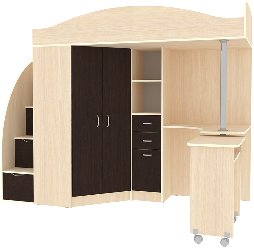 Кровать чердак Юниор 4 - уникальная модель, которая непременно понравится своей комфортностью, оригинальностью и вместительностью. Большое количество оттенков помогут подобрать мебель по вкусу ребенку и интерьеру комнаты. На цветных фасадах светло-бежевая кромка. Такая детская мебель является максимально удобной, соединяя в оригинальный комплект большое спальное место, удобное место для уроков и большой шкаф для одежды. Подойдет такой комплект для мальчика и девочки, ведь разнообразие расцветок может быть составлено в соответствии с вкусовыми предпочтениями ребенка и выбранной тематикой. Модель универсальна - сторона определяется при сборке. Матрасы в комплект не входят - приобретаются отдельно.Характеристики
