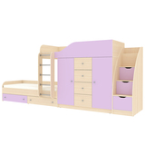 Двухъярусная кровать со шкафом Астра 6 с лестницей комодом отлично подойдет как для малышей, так и для подростков. Конструкция изделия позволяет освободить больше места в помещении для активных игр. Все края имеют безопасные скругления. Преимущества: практичность — большое количество мест для хранения вещей и игрушек поможет малышу самому научиться наводить порядок; компактность — комплекс имеет небольшой размер и станет идеальным вариантом для маленькой детской комнаты; безопасность — все края имеют безопасные скругления. Характеристики: Цвет кромки на цветных фасадах - светло-бежевый. Материал каркаса: ЛДСП 16 мм. Материал перекладин лестницы: металл. Размер верхней кровати (ВхШхГ): 358 х 1916 х 895 мм. Размер нижней кровати (ВхШхГ): 550 х 1941 х 895 мм. Размер спального места (ШхГ): 800 х 1900 мм. Рекомендуемая высота матраса: 100-150 мм. Максимальная нагрузка на верхнее место: 100 кг. Максимальная нагрузка на нижнее место: 120 кг. Высота бортика: 320 мм. Ориентация сборки: универсальная.Характеристики