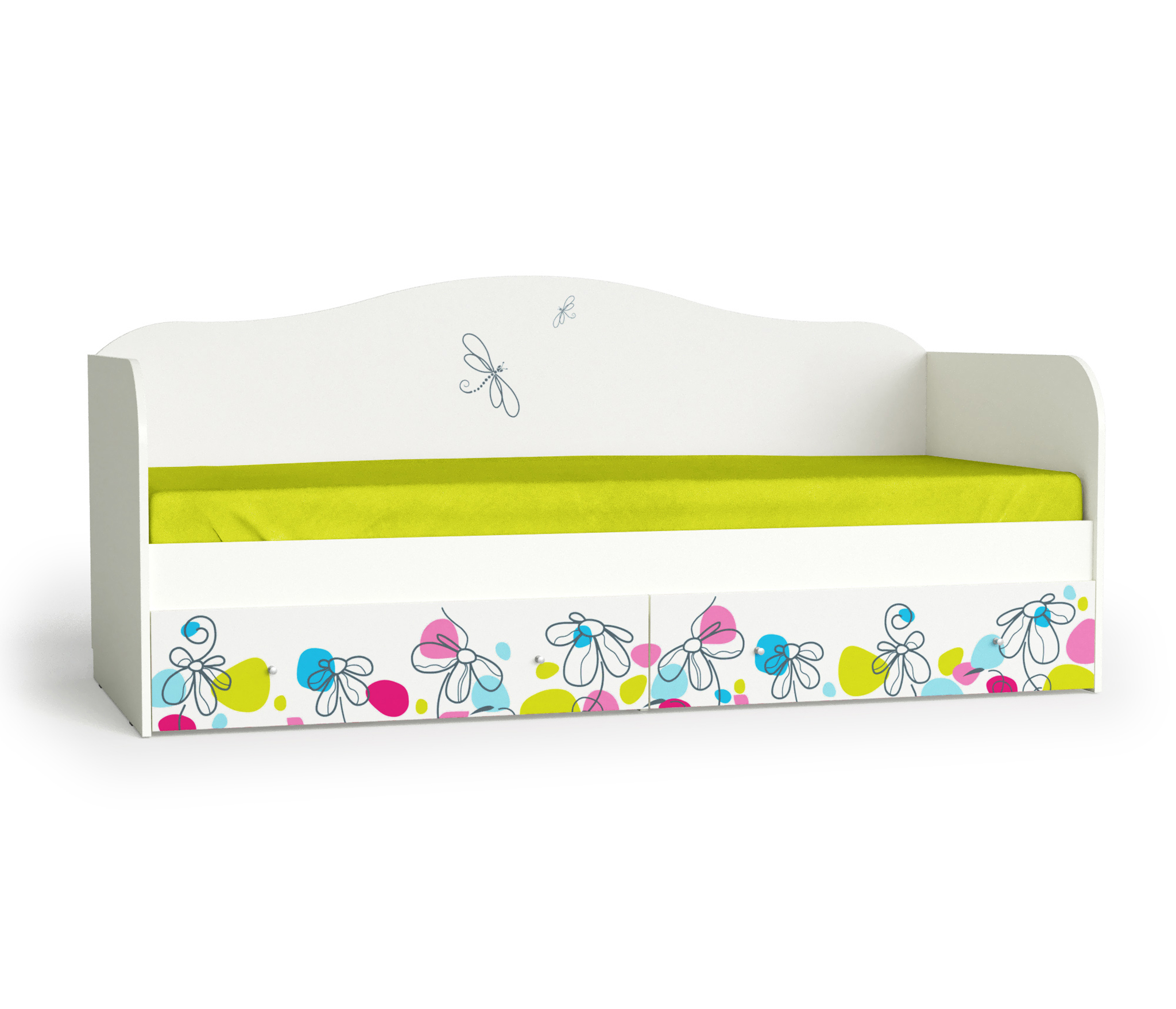 Кровать с выдвижными ящиками из коллекции мебели для детской комнаты "Цветы". Производство Россия. Изготовлена из ЛДСП с УФ печатью. Направляющие на выдвижных ящиках шариковые полного выдвижения. Основание настил из ЛДСП. Габаритные размеры (см): Длина: 194 Глубина: 85 Высота: 85,5 Материал: ЛДСП Цвет: Белый / БелыйХарактеристики