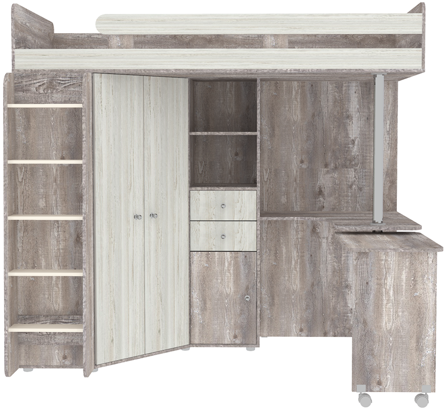 Габариты: Ш2035хГ1370хВ1850мм Спальные места: 800х2000мм Материал: европейская ЛДСП (ДСП класса Е1), импортная фурнитура, все лицевые кромки покрыты ПВХЦвет кромки на цветных фасадах - светло-бежевый. Гарантия производителя – 12 мес. Занимает всего 2 кв.метра Максимальная нагрузка при интенсивной эксплуатации (с учётом матраса) – 80 кг Универсальная сборка, при необходимости собирается как в левую, так и в правую стороны т.е. расположение элементов мебели определяется при сборке Высота безопасного бортика составляет 270 мм, не рекомендуем матрас высотой более чем 14 см. Все цветные фасады производятся со светло-бежевой кромкой Дно кровати – лист ДСП 16 мм Наполнение шкафа - штанга для одежды + 3 полки. Длина столика на колесах 50 см Лестница возможна с металлической лестницейс деревянными ступенькамиСостоит из: