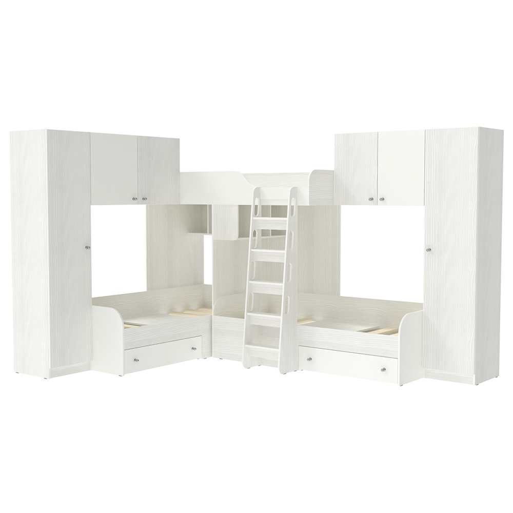Трехместная кровать с полноценными спальными местами стала еще вместительнее. Два больших шкафа с каждой стороны позволять разместить теперь точно все вещи Ваших детей.Характеристики