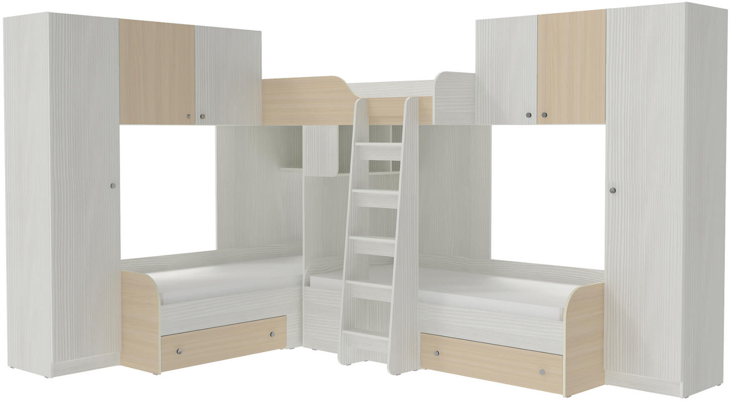 Трехместная кровать с полноценными спальными местами стала еще вместительнее. Два больших шкафа с каждой стороны позволять разместить теперь точно все вещи Ваших детей.Характеристики