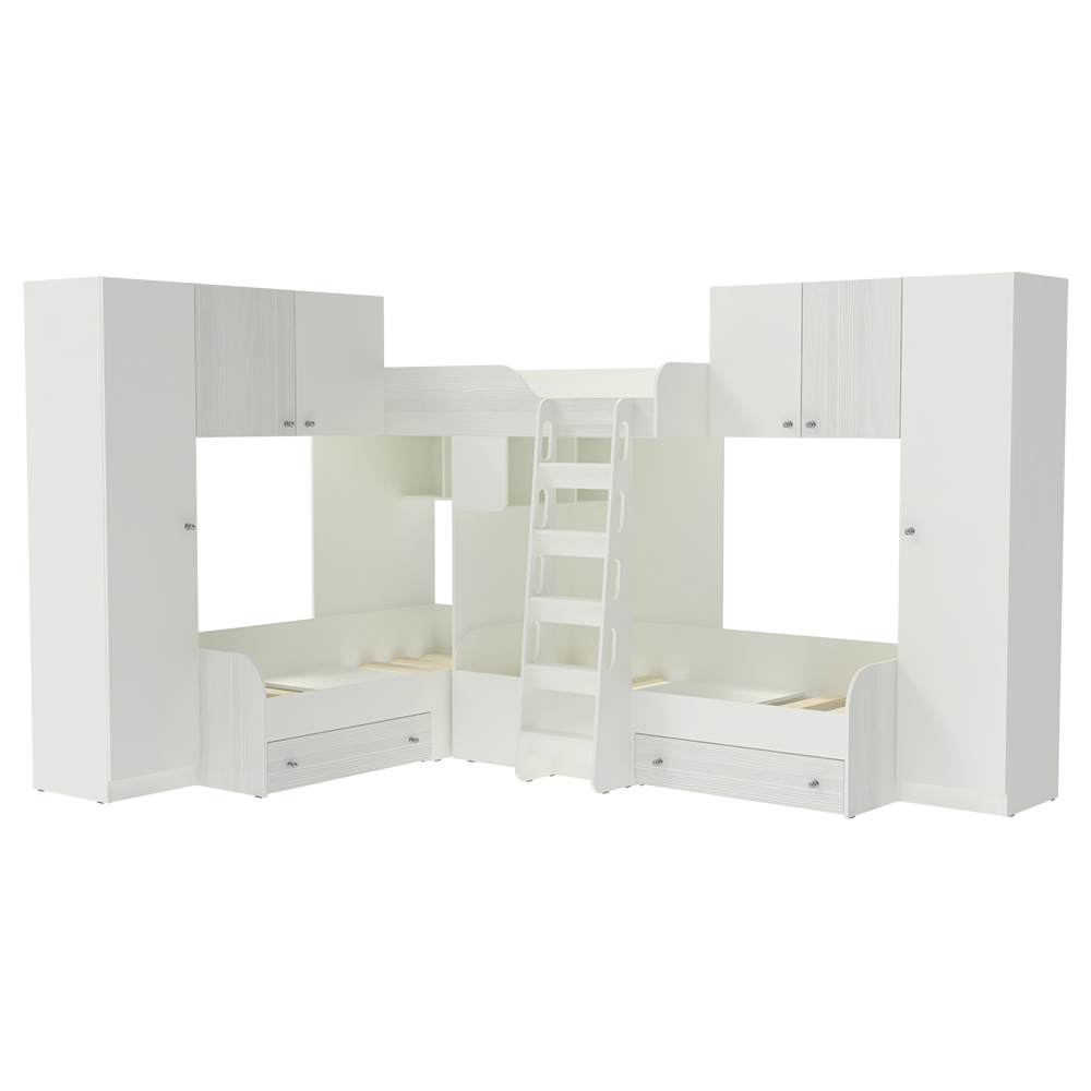 Трехместная кровать с полноценными спальными местами стала еще вместительнее. Два больших шкафа с каждой стороны позволять разместить теперь точно все вещи Ваших детей.Характеристики