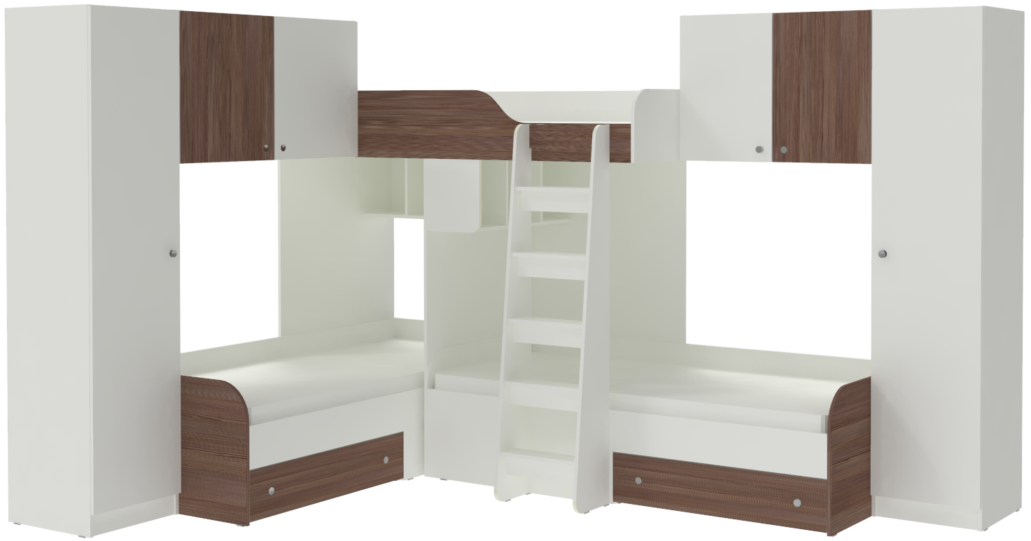 Трехместная кровать с полноценными спальными местами стала еще вместительнее. Два больших шкафа с каждой стороны позволять разместить теперь точно все вещи Ваших детей.Характеристики
