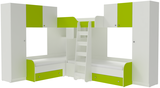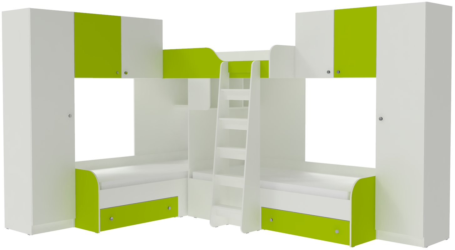 Трехместная кровать с полноценными спальными местами стала еще вместительнее. Два больших шкафа с каждой стороны позволять разместить теперь точно все вещи Ваших детей.Характеристики