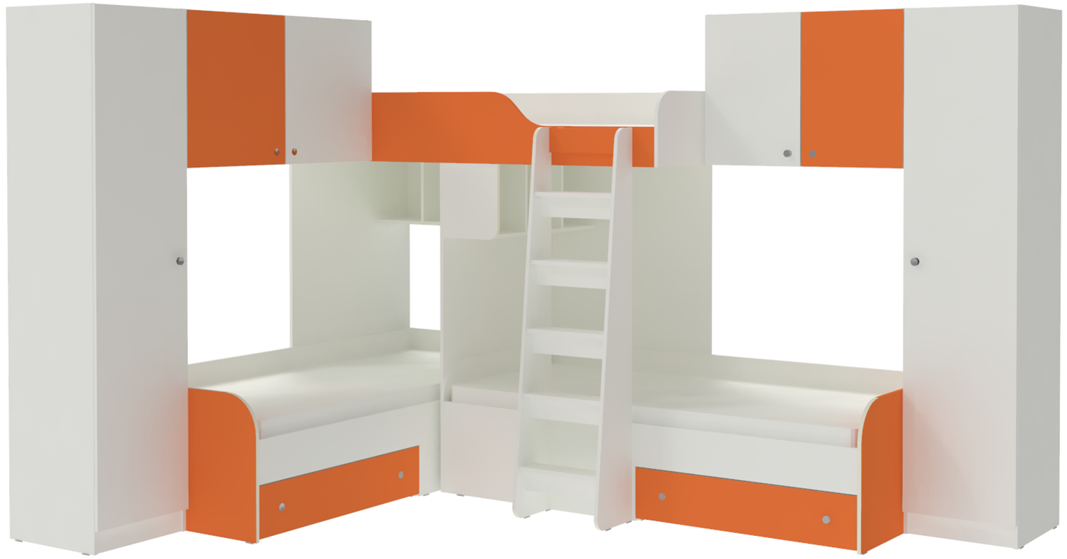 Трехместная кровать с полноценными спальными местами стала еще вместительнее. Два больших шкафа с каждой стороны позволять разместить теперь точно все вещи Ваших детей.Характеристики