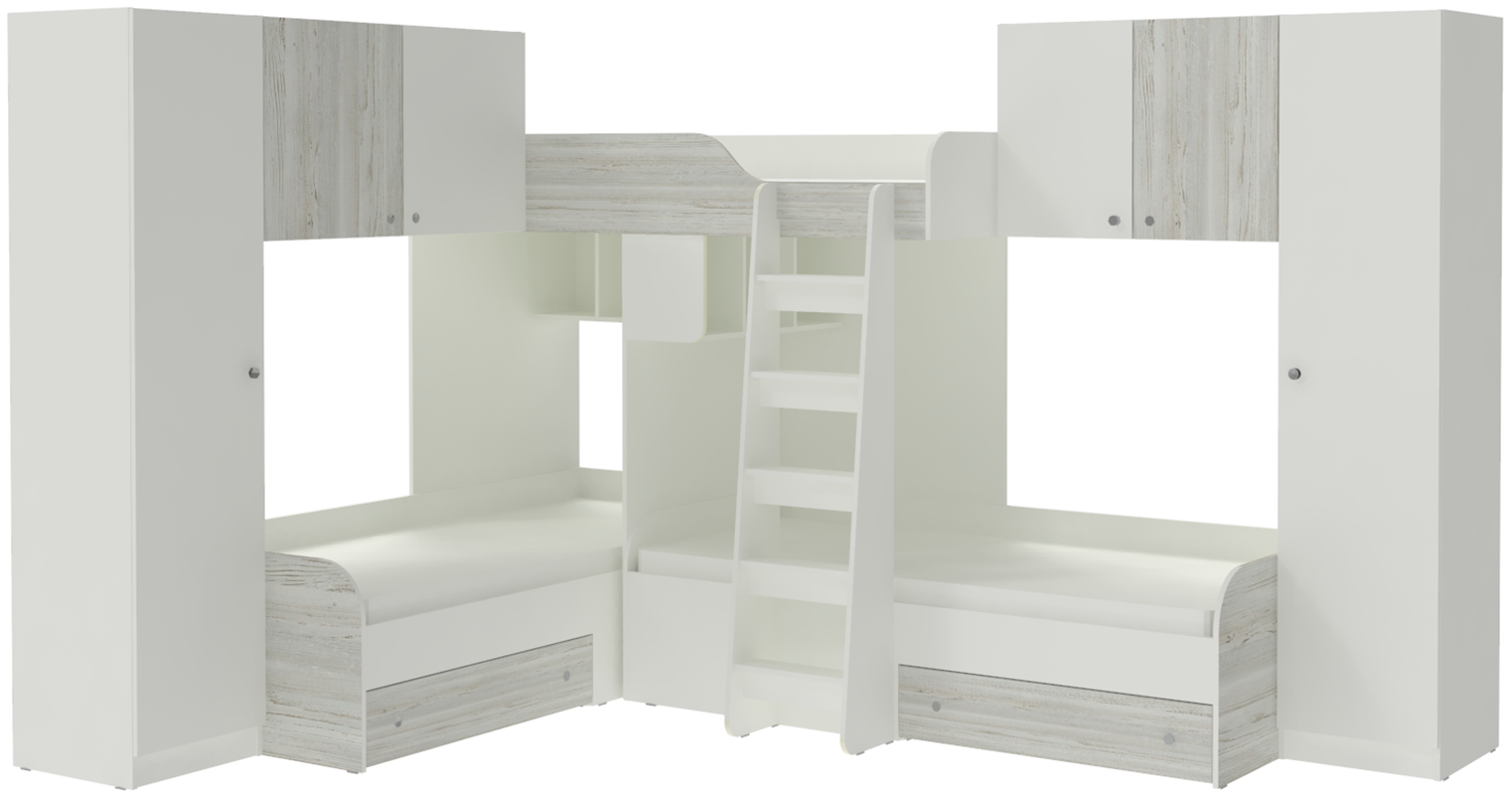 Трехместная кровать с полноценными спальными местами стала еще вместительнее. Два больших шкафа с каждой стороны позволять разместить теперь точно все вещи Ваших детей.Характеристики