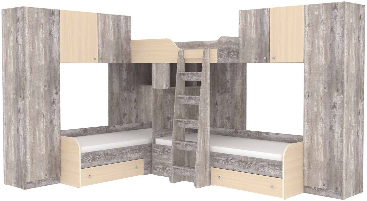 Трехместная кровать с полноценными спальными местами стала еще вместительнее. Два больших шкафа с каждой стороны позволять разместить теперь точно все вещи Ваших детей.Характеристики